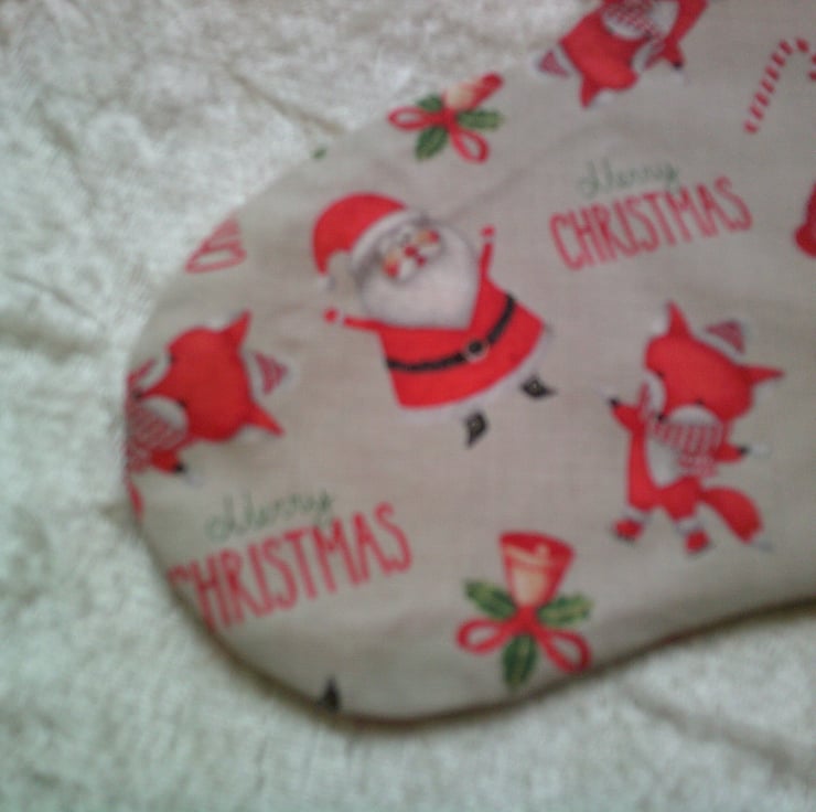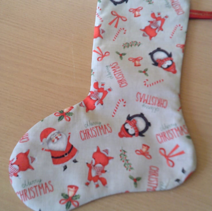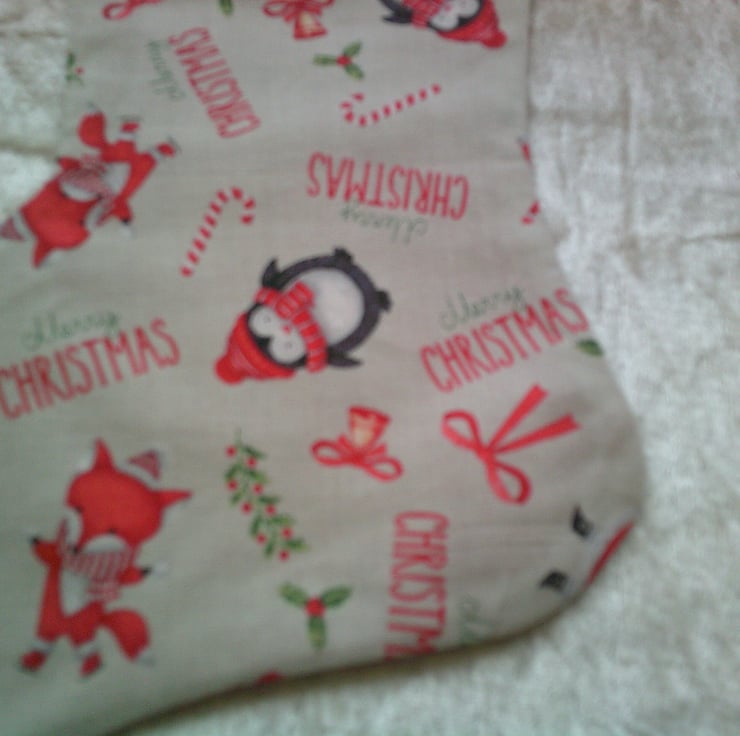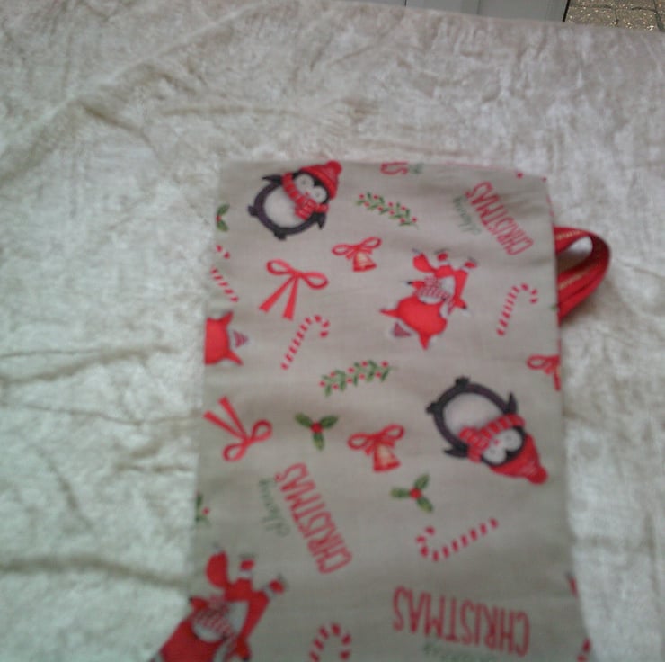 The fabric used is of Santa, Penguins and Foxes with bells and bows with the wording Merry Christmas a pale grey background.