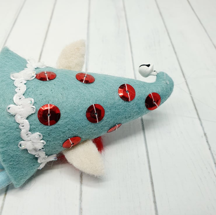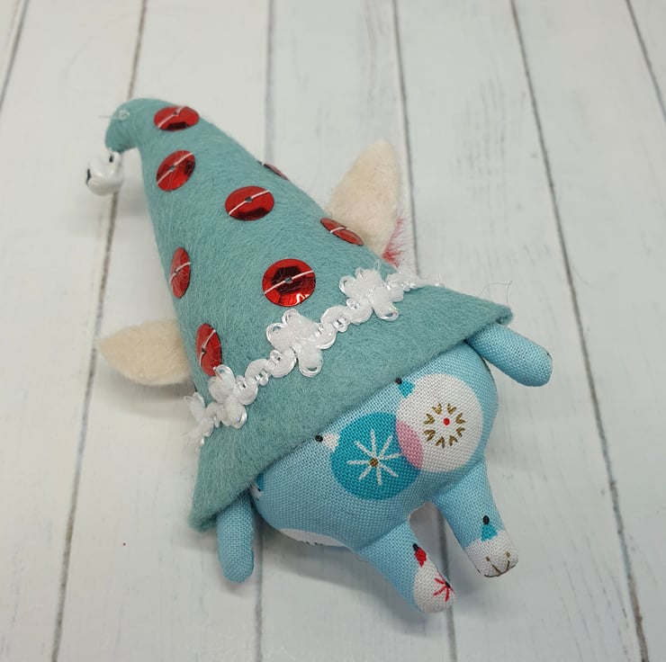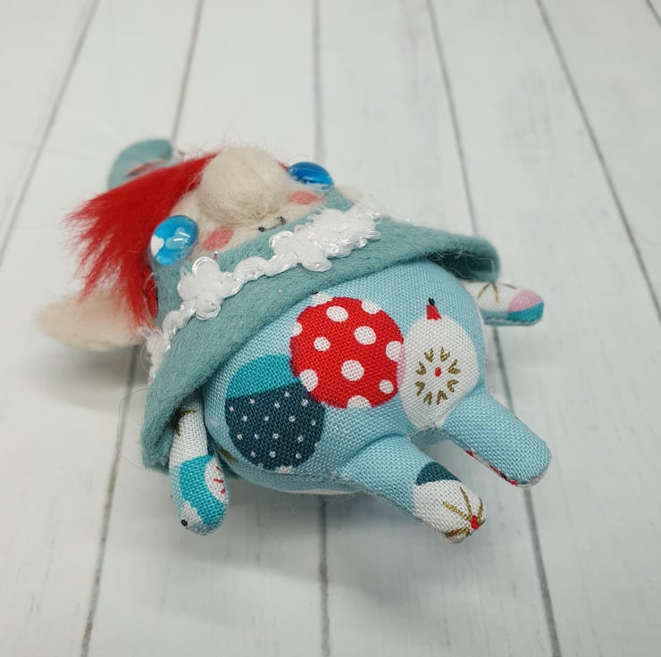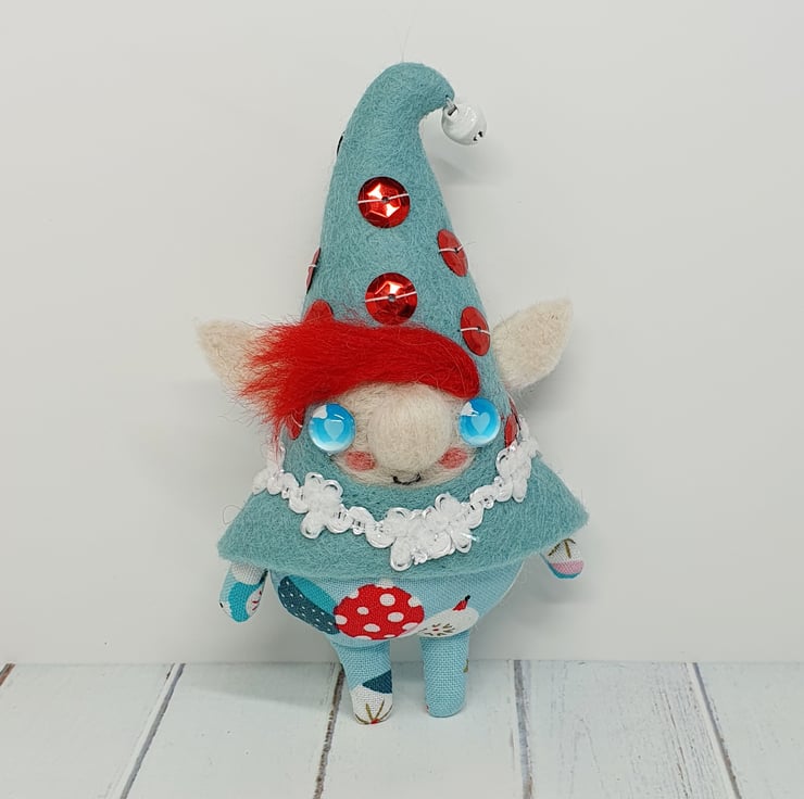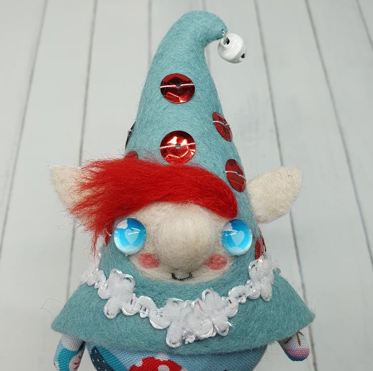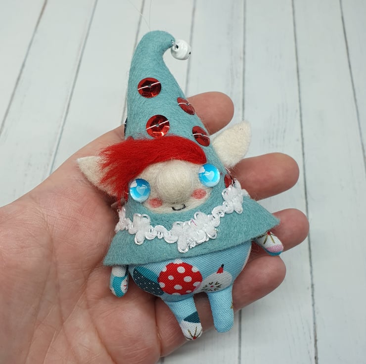 Handmade elf with needlefelted face and glass eyes. This elf is hand sewn with little bell on the end of its Curly felt hat, hat is decorated with red sequins. Elf wears bauble print cotton on their body. Elf has wool hair needle felted into place. This elf is a one of a kind and measures roughly 11.5cm tall with a 8cm ear span. Elf comes with transparent loop hanger attached.