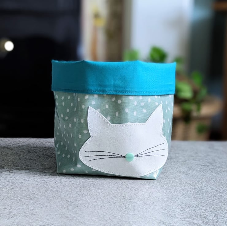 These duck-egg blue oilcloth storage baskets have a stylised cat motif appliqued on the outside and are lined with a turquoise polyester cotton lining. They are perfect for anywhere in the home or for keeping the cat toys tidy!!