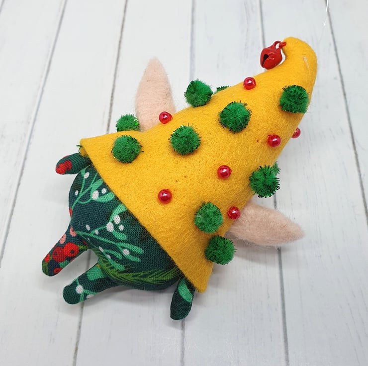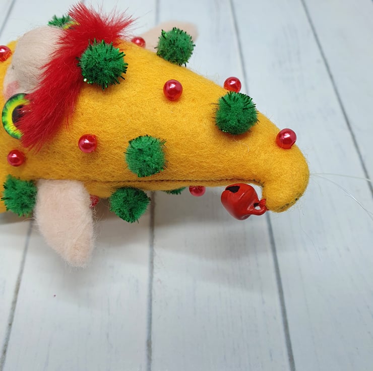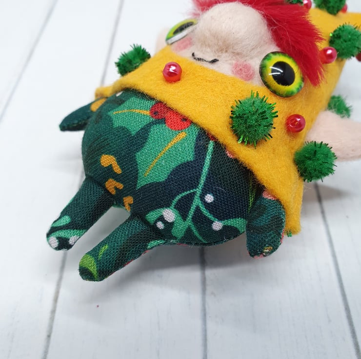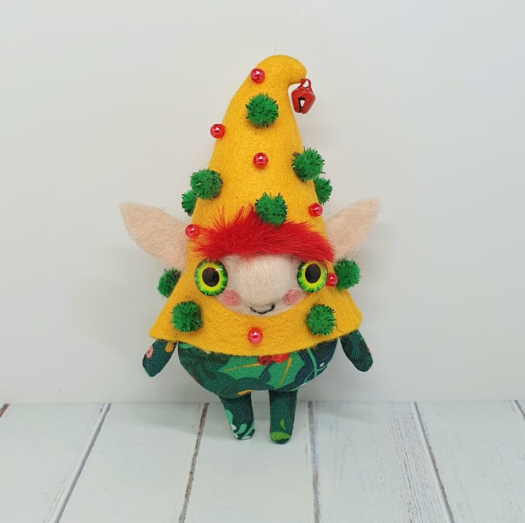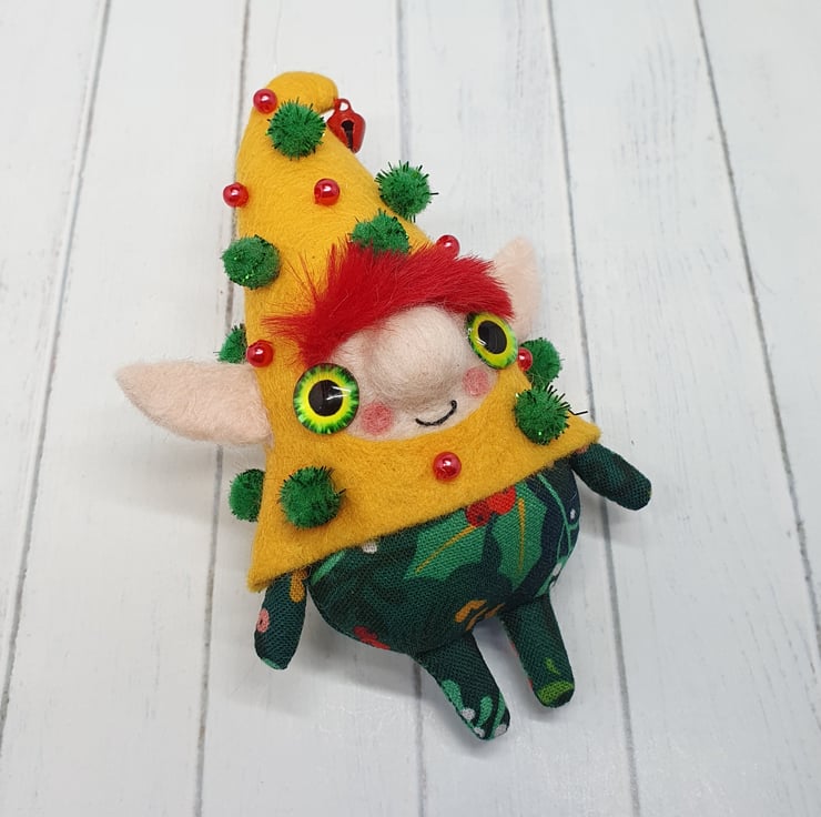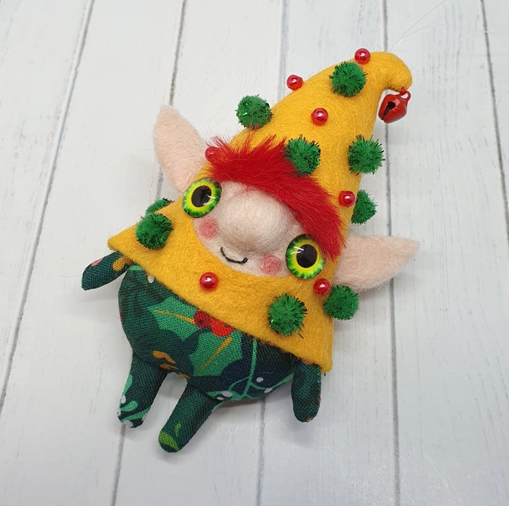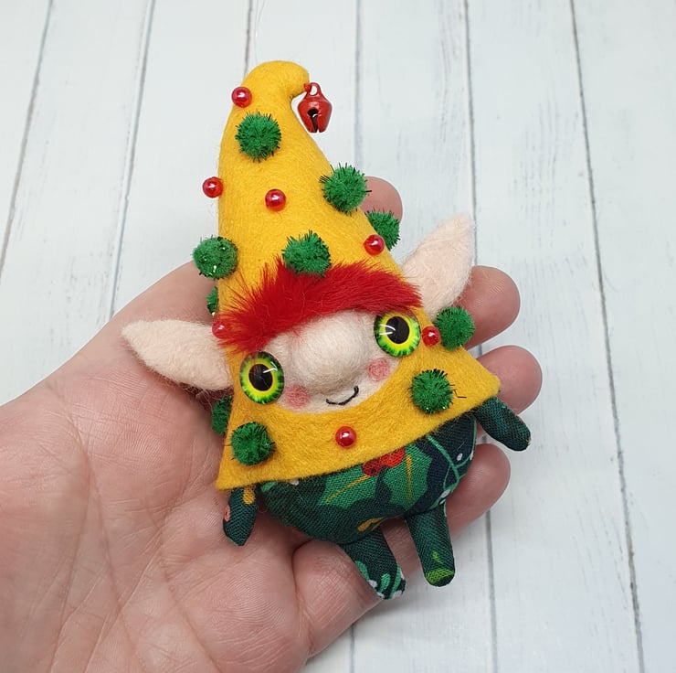 Handmade elf with needlefelted face and glass eyes. This elf is hand sewn with little bell on the end of its Curly felt hat, hat is decorated with beads and sparkly pom poms. Elf wears winter foliage print cotton on their body. Elf has faux fur hair needle felted into place. This elf is a one of a kind and measures roughly 11.5cm tall with a 8cm ear span. Elf comes with transparent loop hanger attached.