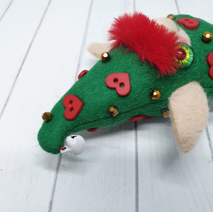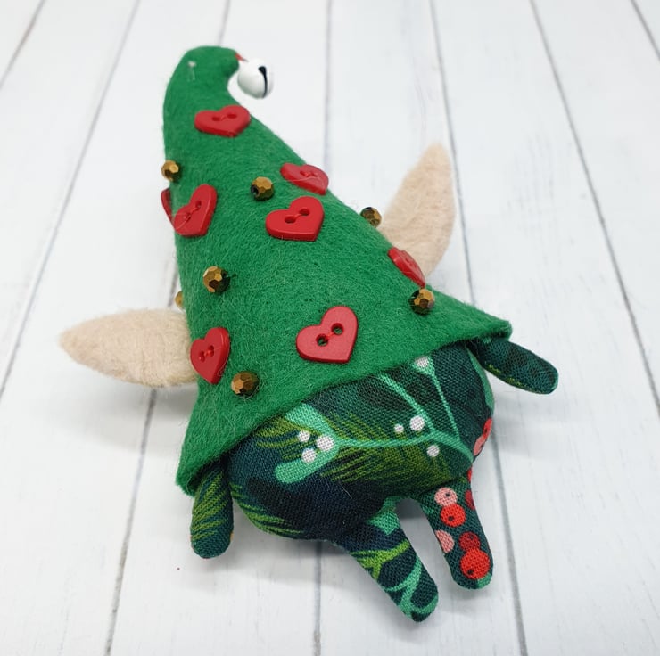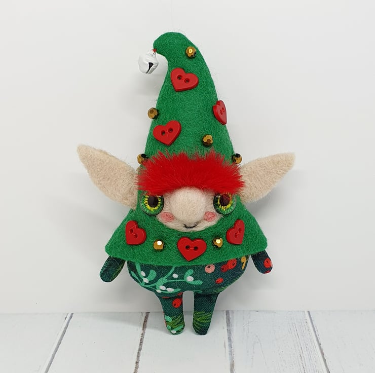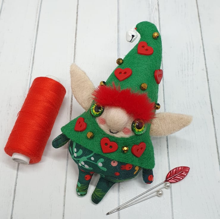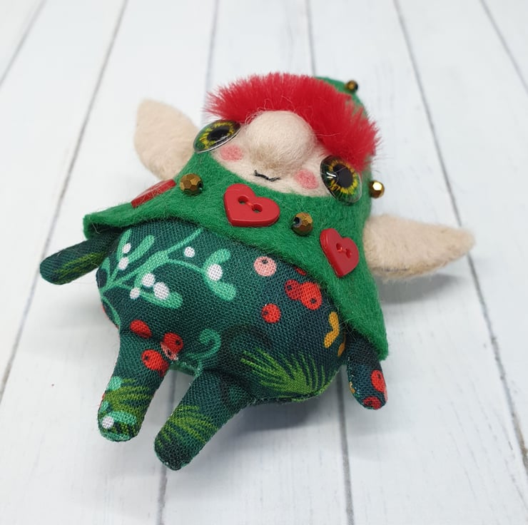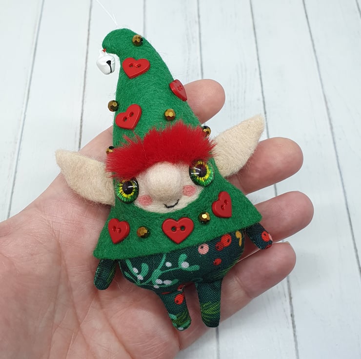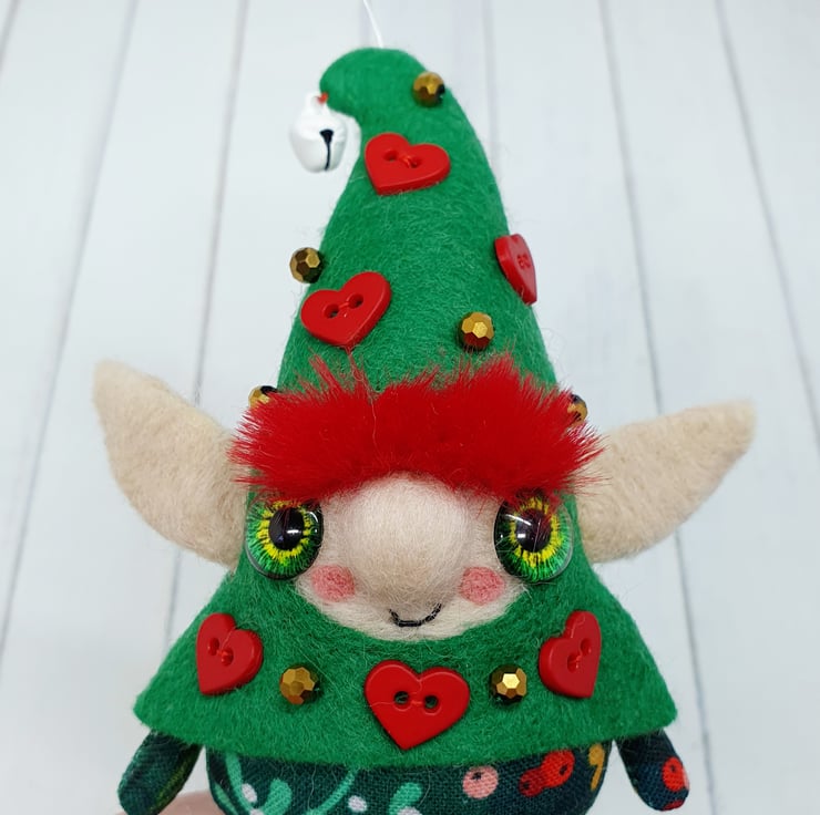 Handmade elf with needlefelted face and glass eyes. This elf is hand sewn with little bell on the end of its Curly felt hat, hat is decorated with beads and red hearts. Elf wears winter foliage print cotton on their body. Elf has faux fur hair needle felted into place. This elf is a one of a kind and measures roughly 11.5cm tall with a 8cm ear span. Elf comes with transparent loop hanger attached.