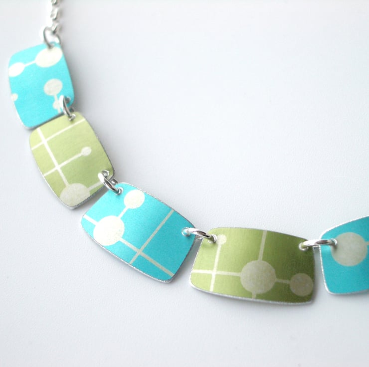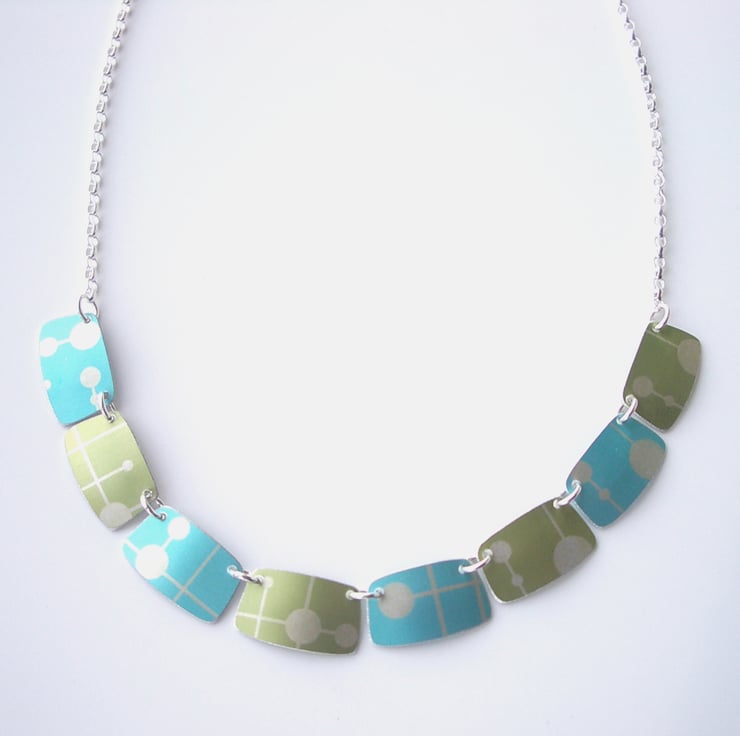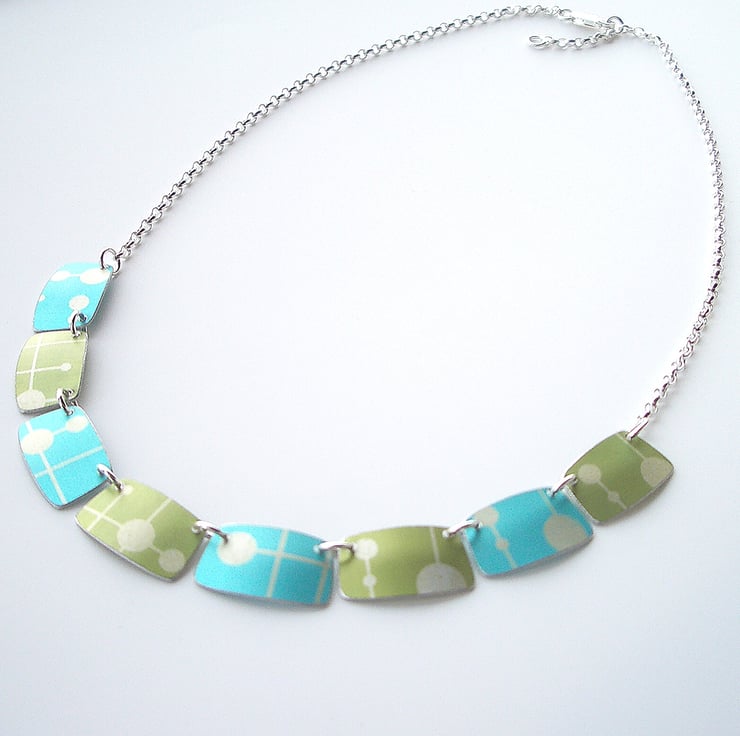 This statement necklace is made from anodised aluminium which I have dyed in turquoise and lime and printed with a mid century style print. I have made each rectangle by hand individually saw piercing them and filing to give a nice smooth finish and finally doming them slightly so that they shimmer in the light. The rectangles are connected with sterling silver jump rings and altogether measure approximately 5.5” I have attached a sturdy sterling silver chain which when added to the rectangles measures 18” in total. The necklace is 18” and can be extended to 19” with the extension chain.