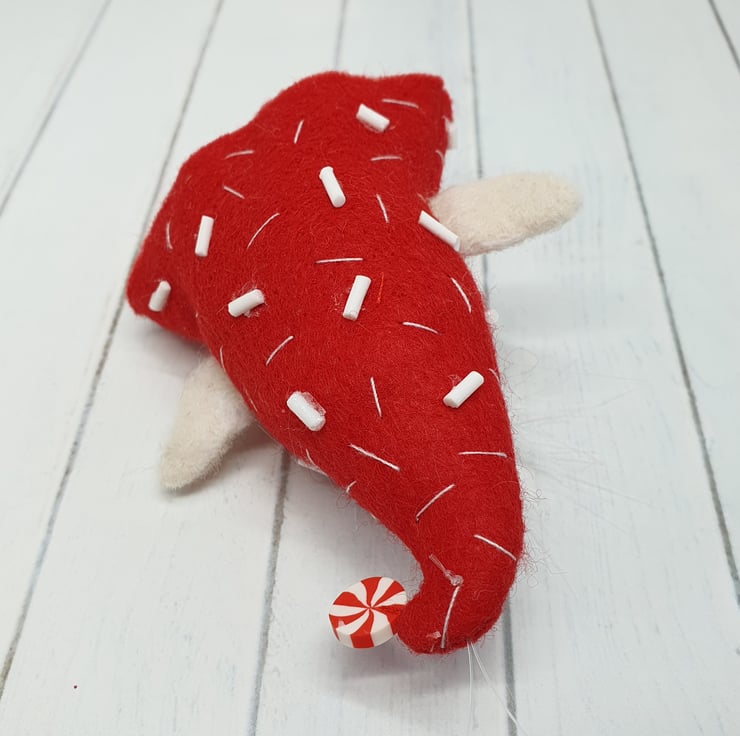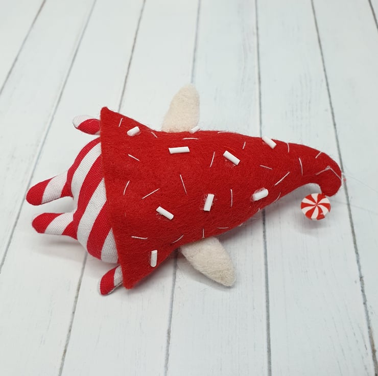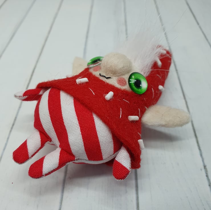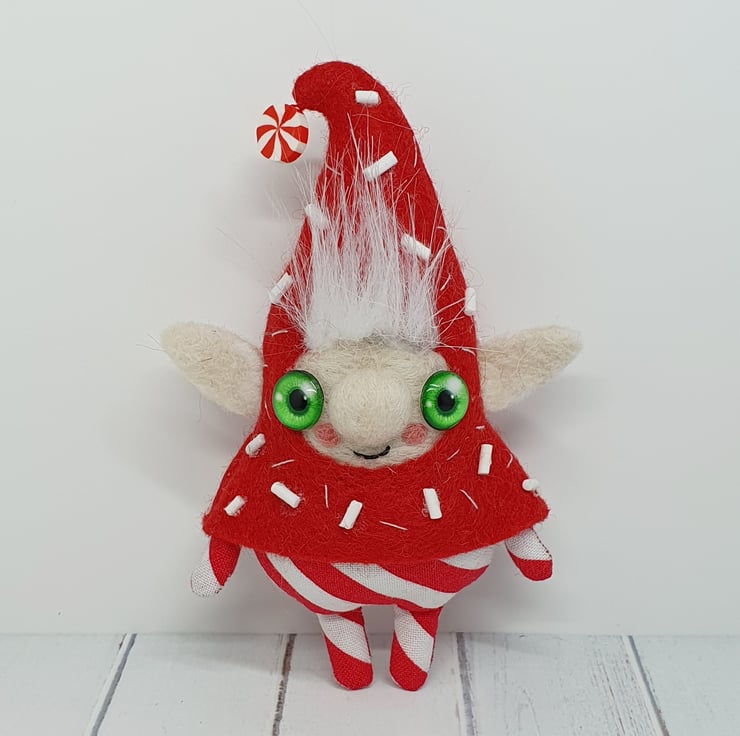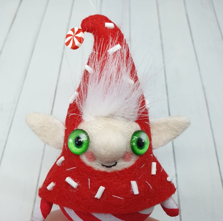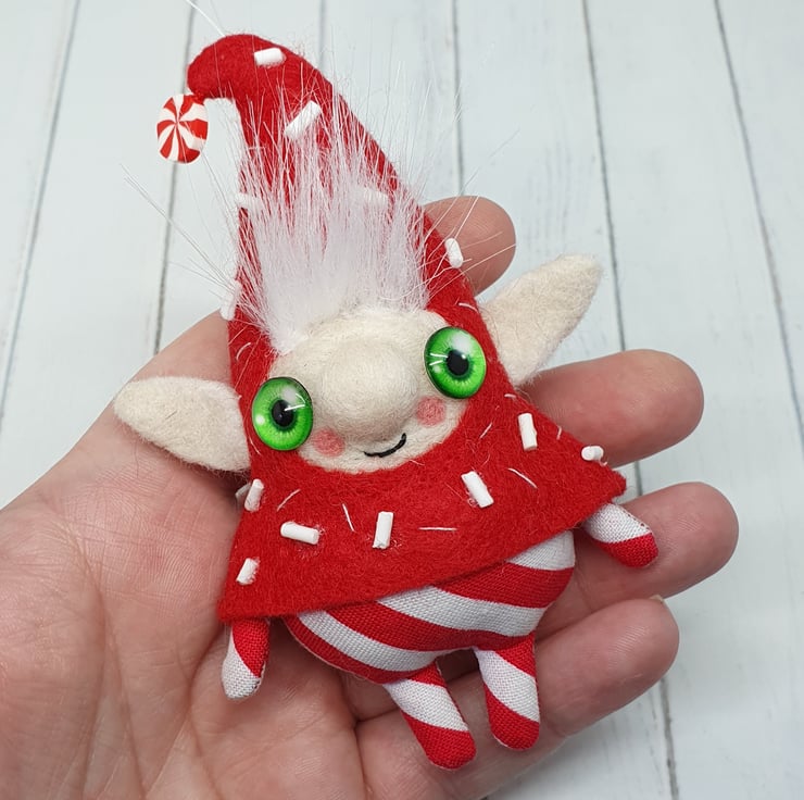 Handmade elf with needlefelted face and glass eyes. This elf is hand sewn with little handmade clay peppermint on the end of its Curly felt hat, hat is decorated with hand embroidery and clay hundreds and thousands. Elf wears striped print cotton on their body. Elf has faux fur hair needle felted into place. This elf is a one of a kind and measures roughly 11cm tall with a 7.5cm ear span. Elf comes with transparent loop hanger attached.