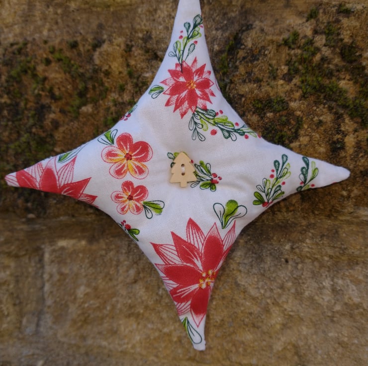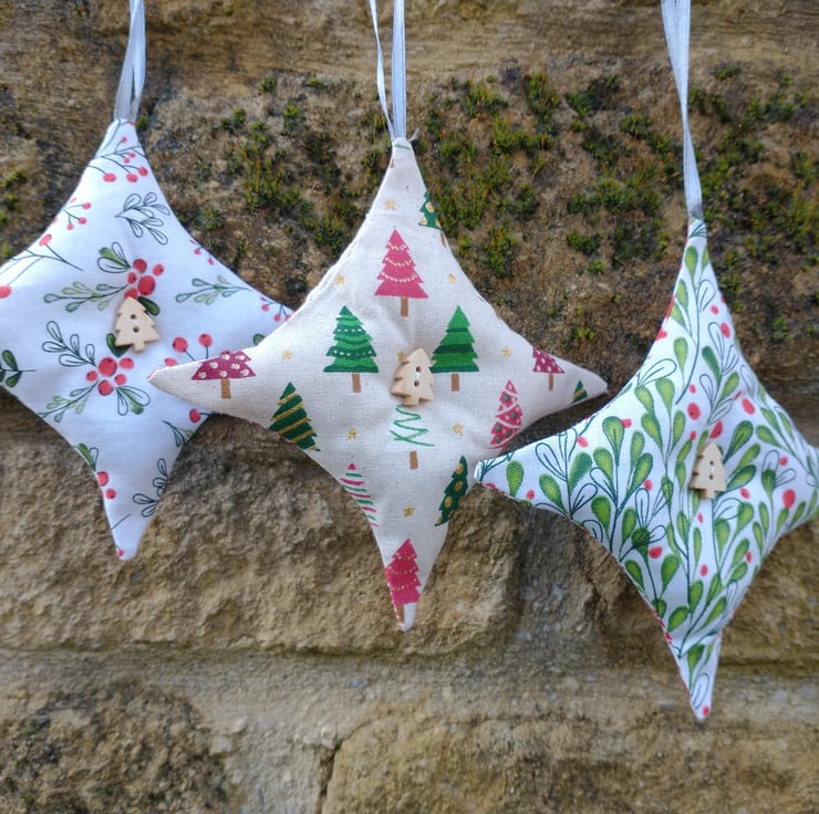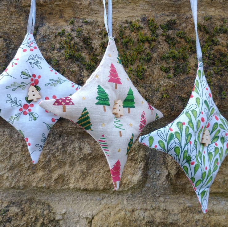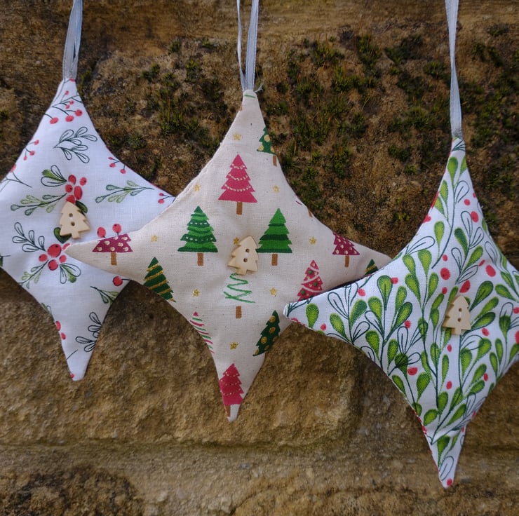 These ornaments were designed and made in my small Cotswolds Studio. Each one is unique, made in Christmas themed fabric with a Christmas tree wooded button in the middle.