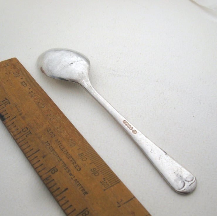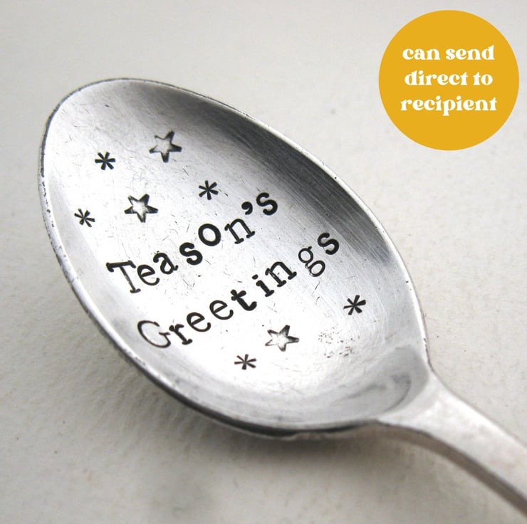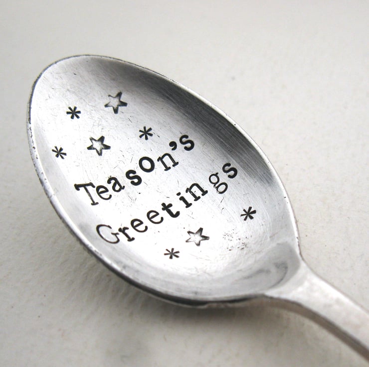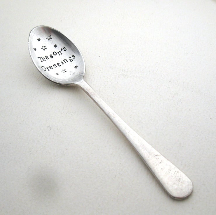 A vintage teaspoon with a plain handle and the words 'Teason's Greetings' hand stamped in the bowl along with some stars and snowflakes. It's a silverplated spoon approx. 13cm long. The handstamped wording is coloured black with water-based acrylic paint. Hand wash with care.