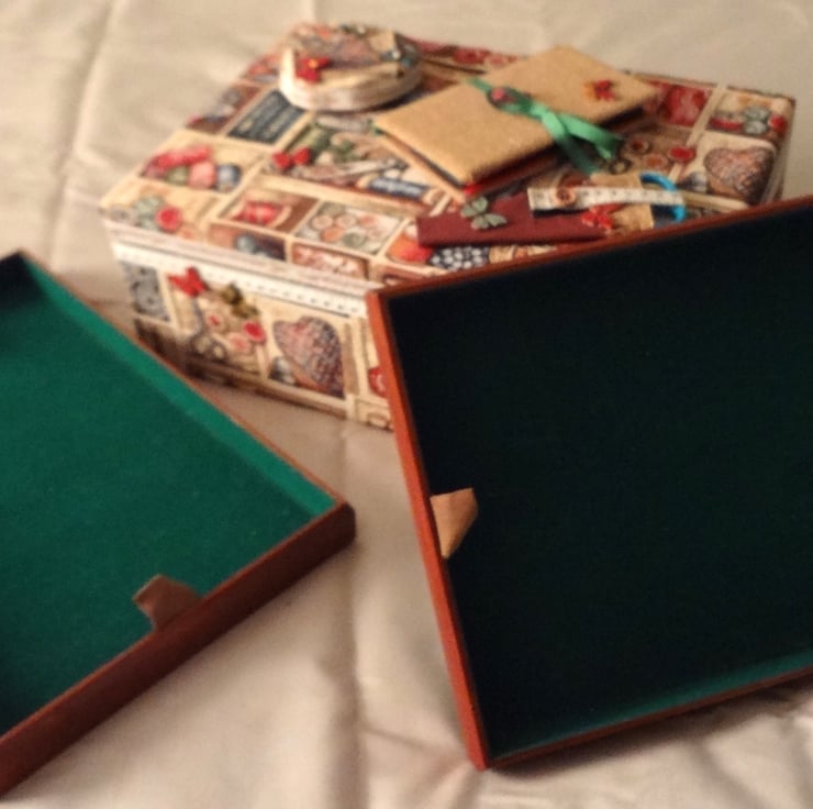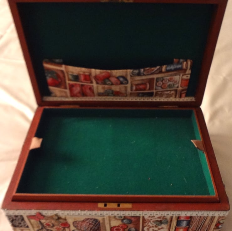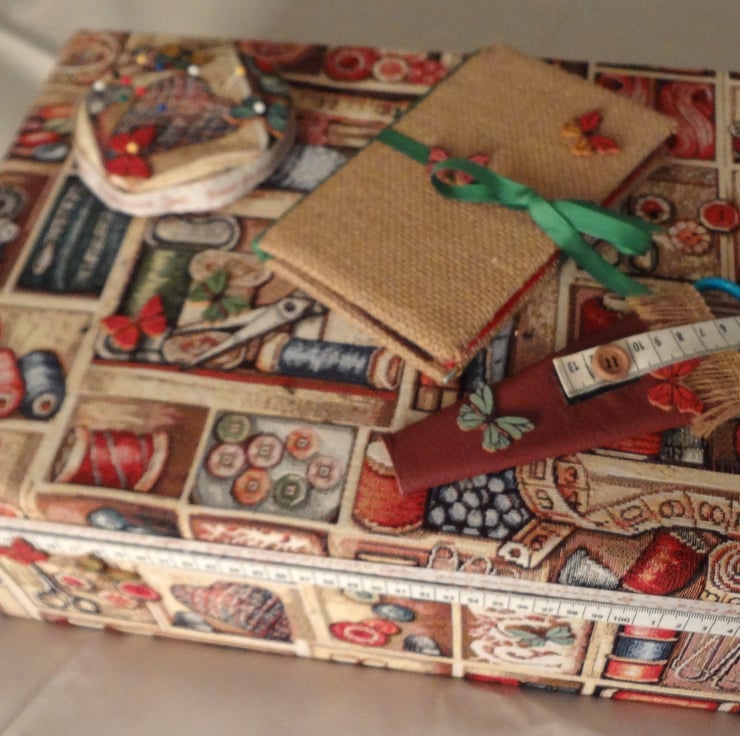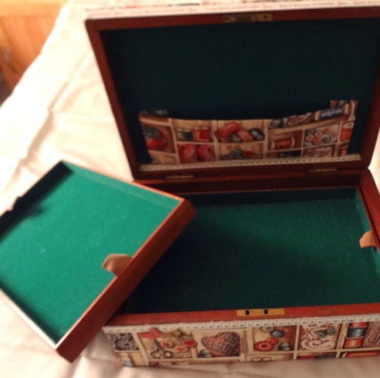 I upcycled this from an old box into a sewing box. It has two trays and a deep interior, the outside has a pin cushion, needle book and scissors in a holder.