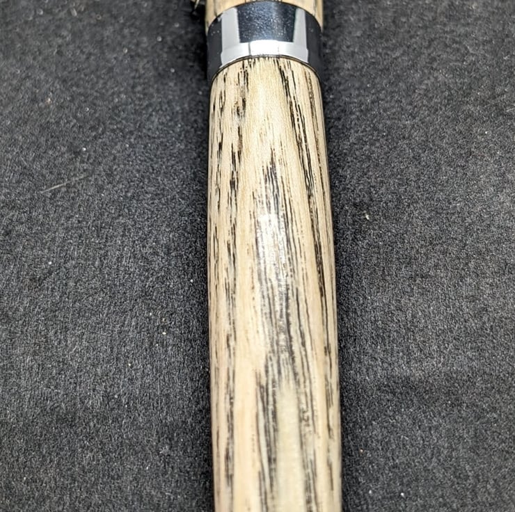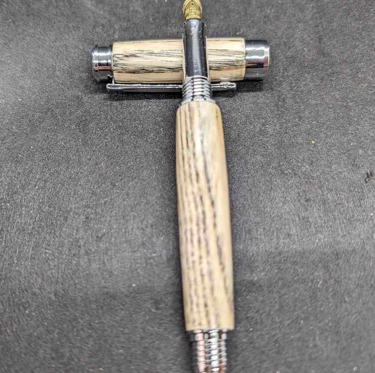 A hand turned high quality fountain pen in spalted beech with chrome metal parts. Spalting produces these black brown lines that create a striking effect against the pale colour of the beech. It has an upgraded German Beaufort premium nib and converter, it will also take standard cartridges, one of which will be supplied and it will be packaged in a material lined card box. Find links to refills at characterpens.co.uk/refill.html F315