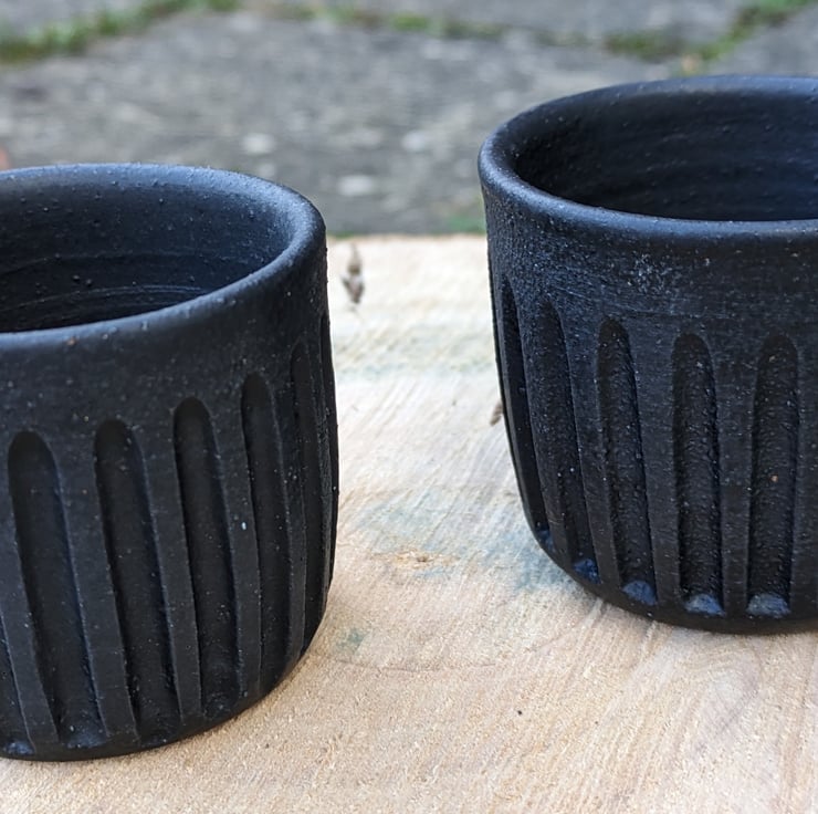 I do like an espresso every now and again & thought I'd make some mini tumblers perfect for the job! Speckled clay with carved sides which helps to dissipate the heat & a wee swirl in the bottom inside in a matte black glaze...love these!! There are two of these which mkae a perfect set but there's also two cream/alabaster versions available - buy all 4 for the set! Fired to c1200 degrees (stoneware temperature) and this makes the tumbler more durable.