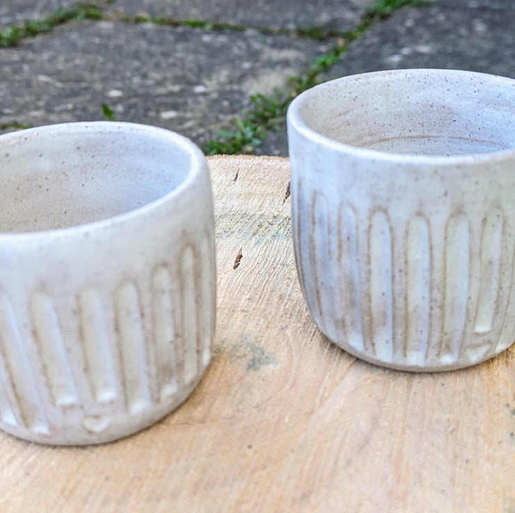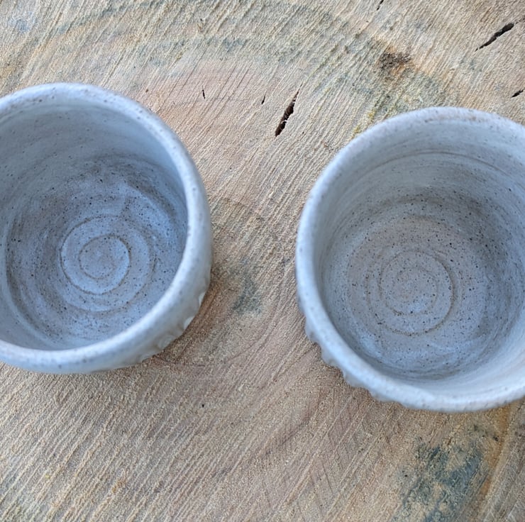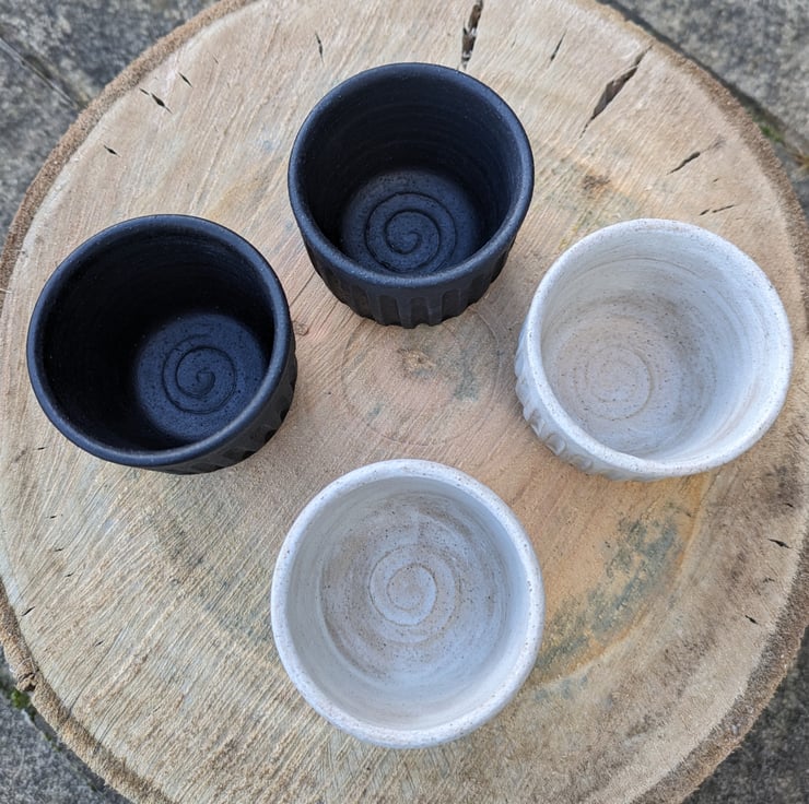 I do like an espresso every now and again & thought I'd make some mini tumblers perfect for the job! You can see the speckled clay popping through the glaze, with carved sides to help dissipate the heat & a wee swirl in the inside base in a matte cream glaze...love these!! Price shown is per cup so please put two in your basket if you wish to buy both. There's also two black versions available - buy all 4 for the set! Fired to c1200 degrees (stoneware temperature) and this makes the tumbler more durable.