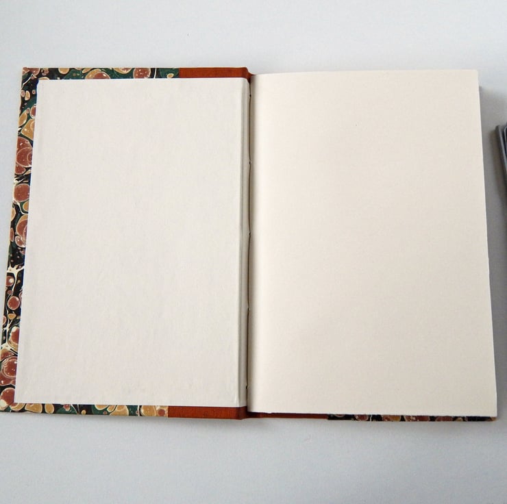 This hard cover traditional notebook or sketchbook has marbled paper covers with a cloth trim. The pages are quality recycled ivory paper, which is hand stitched into the cover.