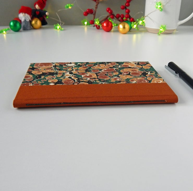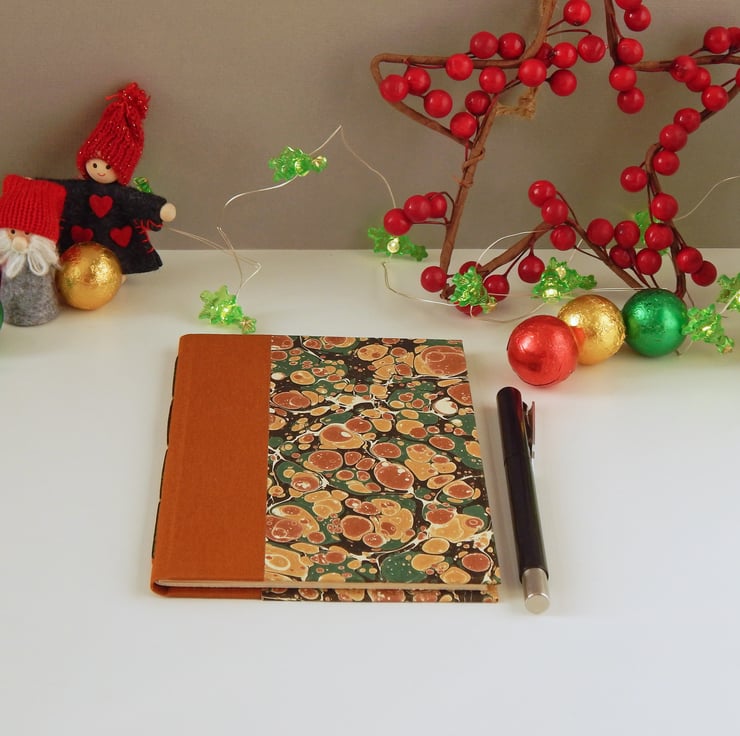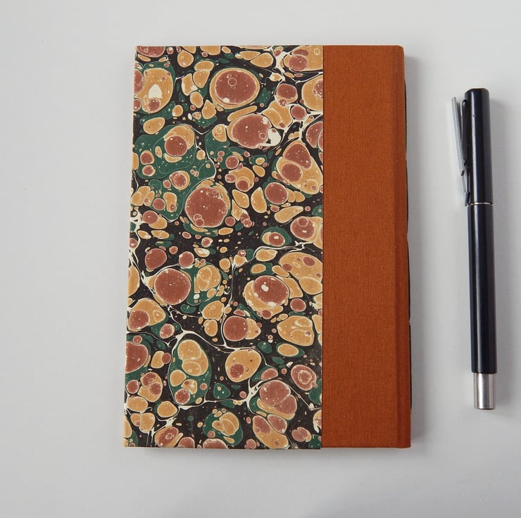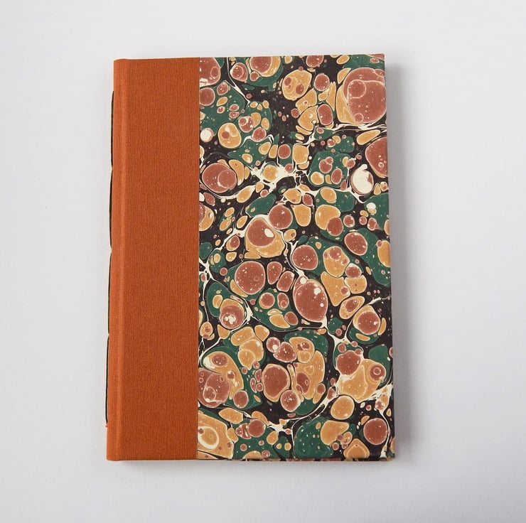 The book has traditional hard covers, panels of hand marbled paper in pale gold, light brown & deep green, with a cloth trimmed spine.