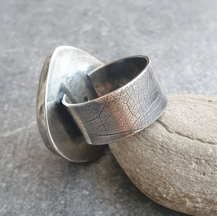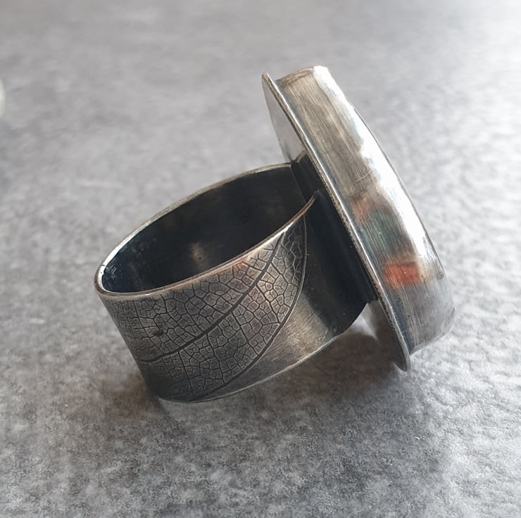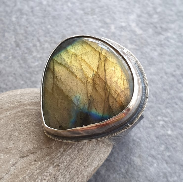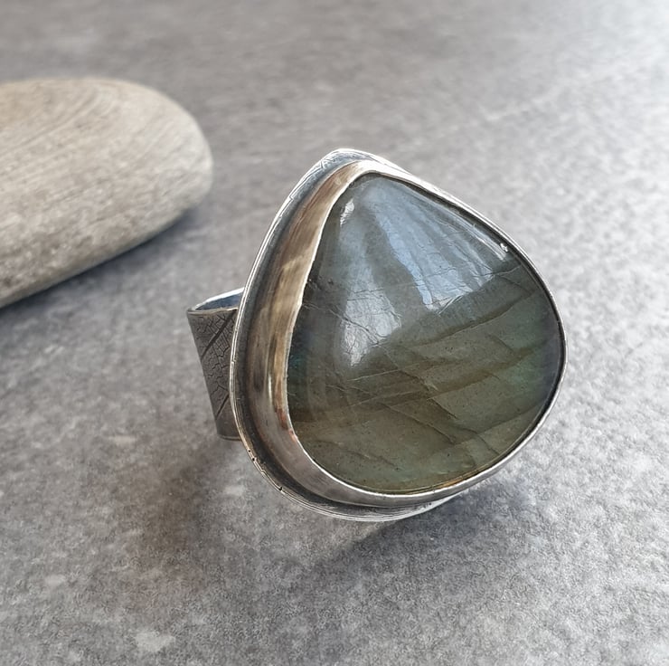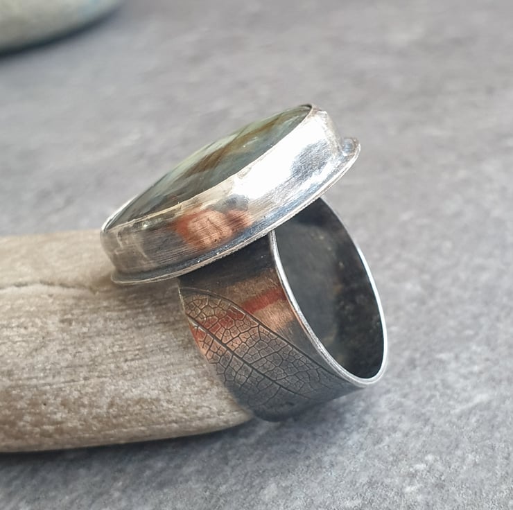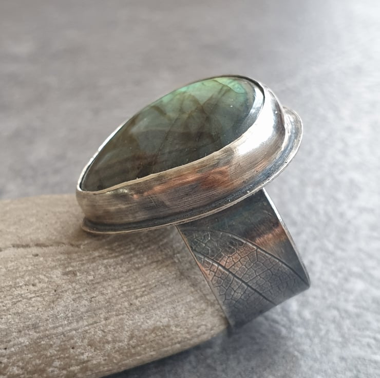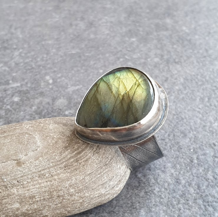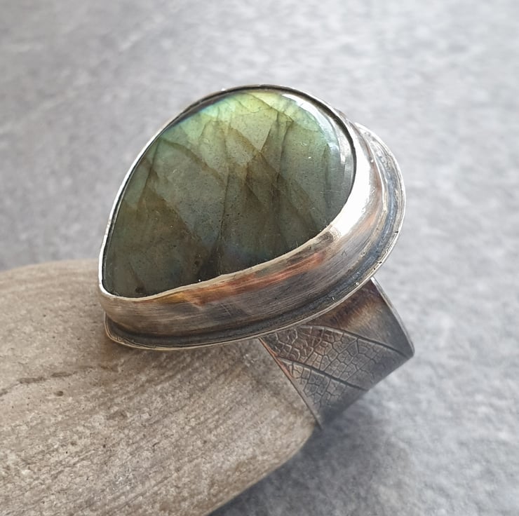 This fabulous ring features a huge labradorite teardrop in golden orange with a small blue flash near the top and black banding running across the stone. It's set in sterling silver and sits on a wide ring band which has a leaf vein texture pattern imprinted into the silver. I've oxidised the silver for a darkly glamourous feel and to show off the texture pattern.