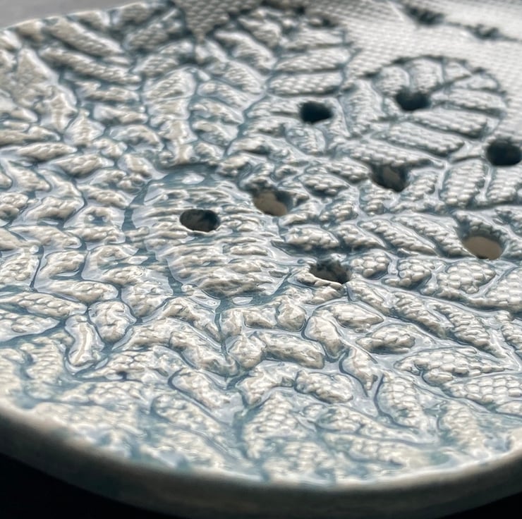 This beautiful dish has been imprinted with a Vintage Crochet Shawl. Glazed in a rich Blue / Grey and rubbed back to further reveal the unique pattern.