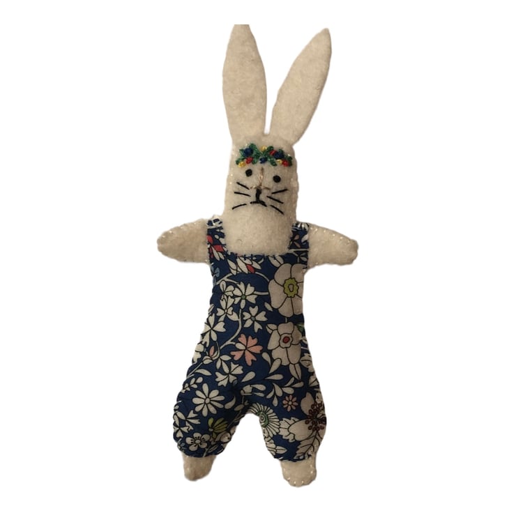 It is made from 100% eco friendly wool felt which is the best quality felt you can get. It's soft but strong and doesn't loose it's shape or go bobbly and it contains no nasty chemicals. It is wearing blue patterned Liberty Print dungarees and has embroidered flowers on it's forehead. If you would like a ribbon attaching so it can be hung on a Christmas tree ,message me and I can easliy attach one for no extra cost.