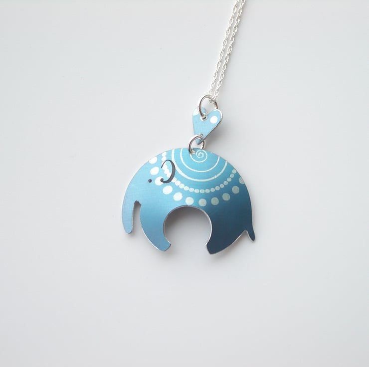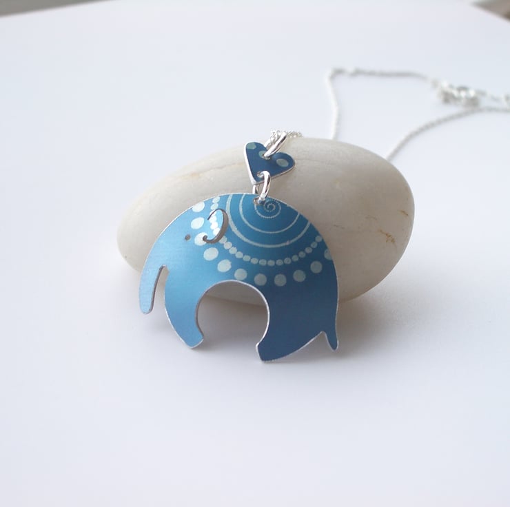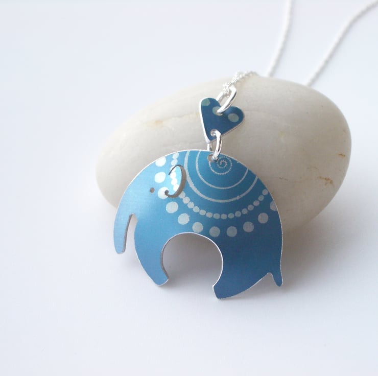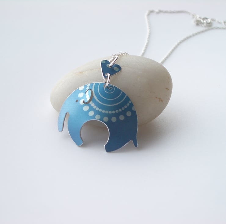 This elephant pendant is hand made from aluminium which I have dyed in a soft blue with a white spiral print and sealed so that the colours become a permanent part of the metal. I cut out the shapes by hand using a piercing saw and file the edges so that it catches the light. The elephant is slightly domed and hangs from a small jade green aluminium heart. The jump rings and chain (16") are all sterling silver. If you would like a different length chain, please ask.