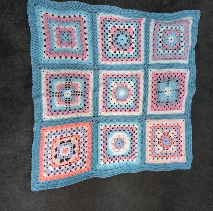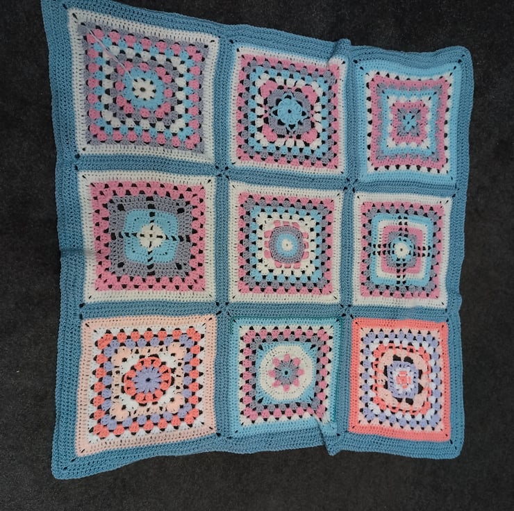 Using Deramores Anti Pilling Yarn in various colours but Blue & Pink being the predominant colours, made from Several Granny Squares crocheted together.