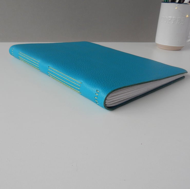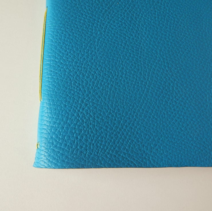 - Cover of thick, flexible calf leather in rich turquoise, with a pebble-grained finish.
