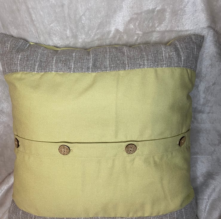 The use of two contrasting fabrics adds visual interest to the back of the cushion which is of an envelope design. The wooden buttons with decorative stars not only serve a functional purpose in closing the cushion cover but also contribute to the overall aesthetic, giving it a rustic and nature-inspired touch.