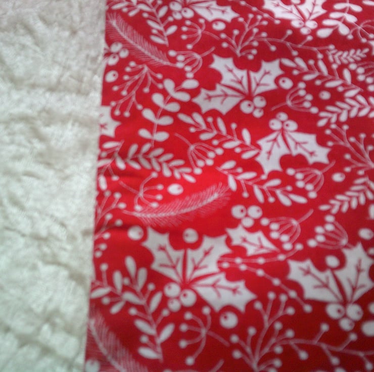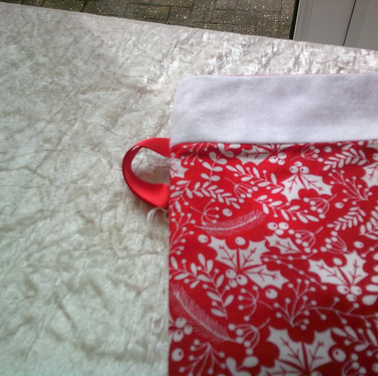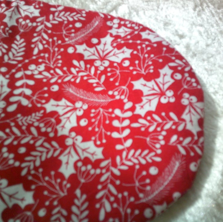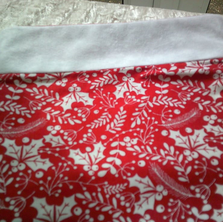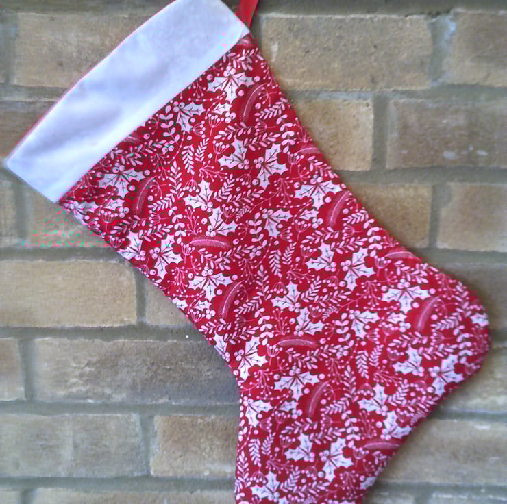 This Christmas Stocking is made using red fabric with a design of holly leaves and berries, feathers and a variety of other seasonal leaves including mistletoe in white. This stocking is trimmed round the top with white fabric and is fully lined.