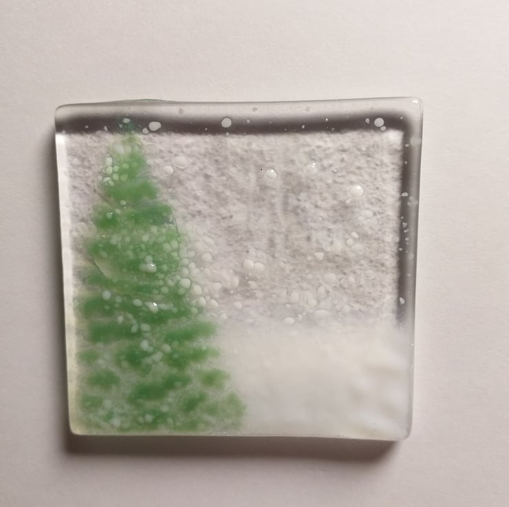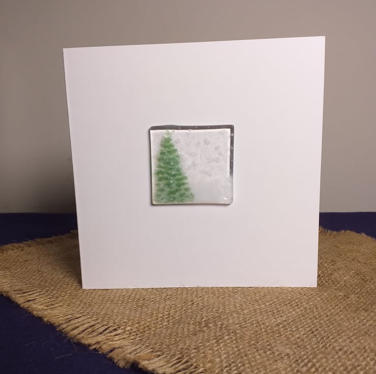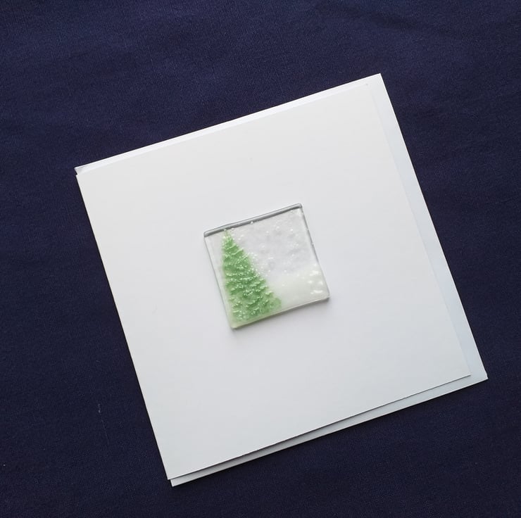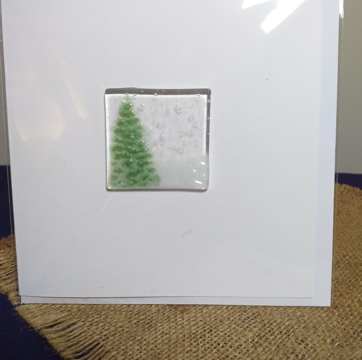 Unique handmade fused glass Christmas card. Each card varies slightly as they are individually crafted. Made from clear bullseye glass, frit and powder. Card is high quality 350gsm, with envelope provided. Inside is blank for your own message. The card comes in a clear film wrap (recyclable at many supermarkets).