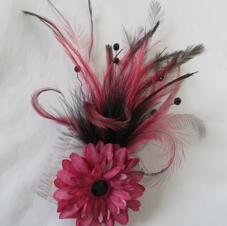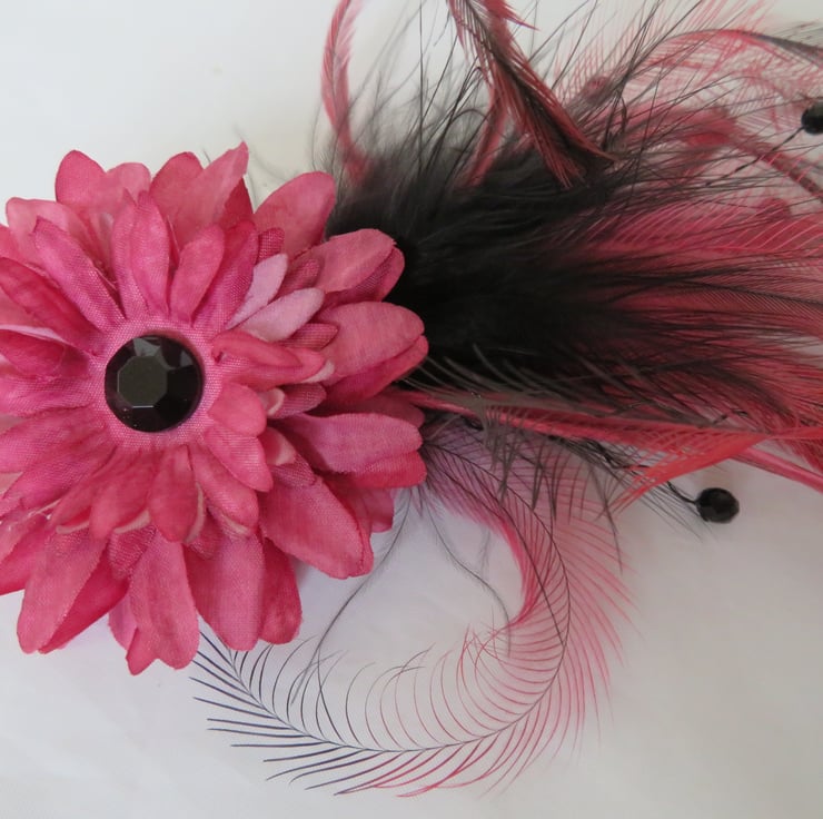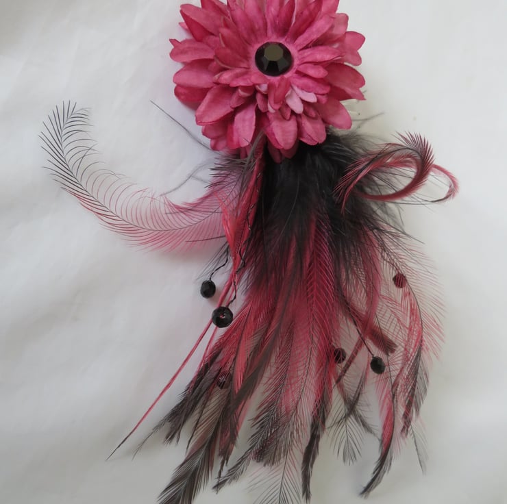 Created with a plume of dusky rose pink emu feathers with black tips, black fluff feathers with black wire stems with black crystals.