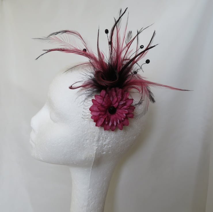 This is a stunning and eye catching vintage Regency style bespoke feather plume clip in headpiece in dusky rose pink & black.