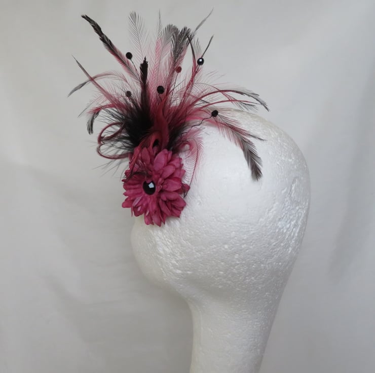 Black & Dusky Pink Feather Flower & Crystal Feather Fascinator