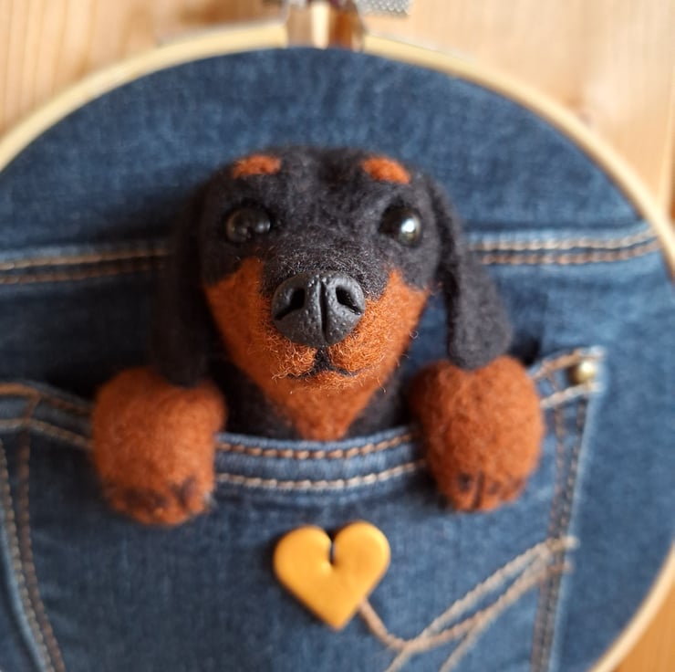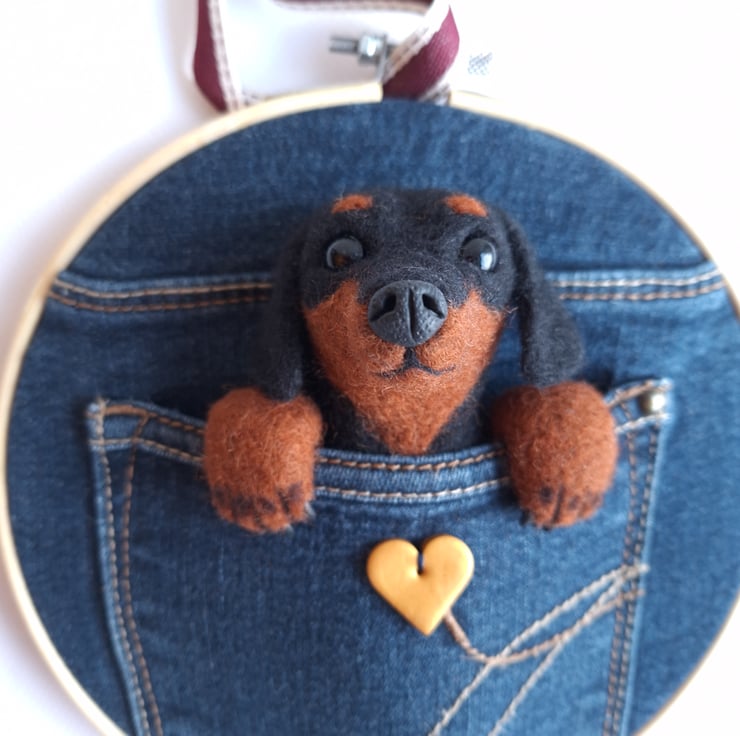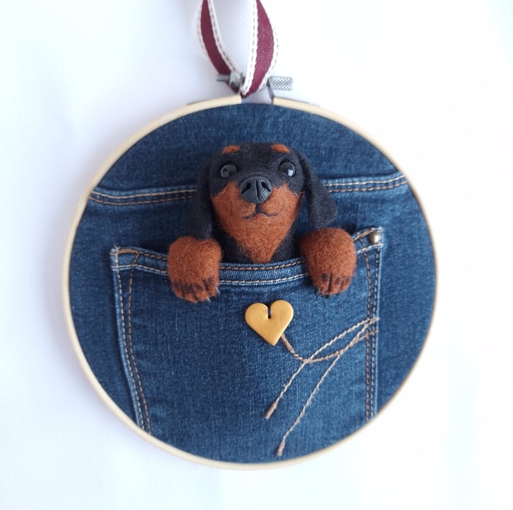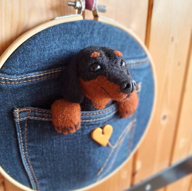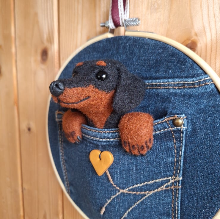 A cute felted Daschund tucked into an upcycled denim pocket!
