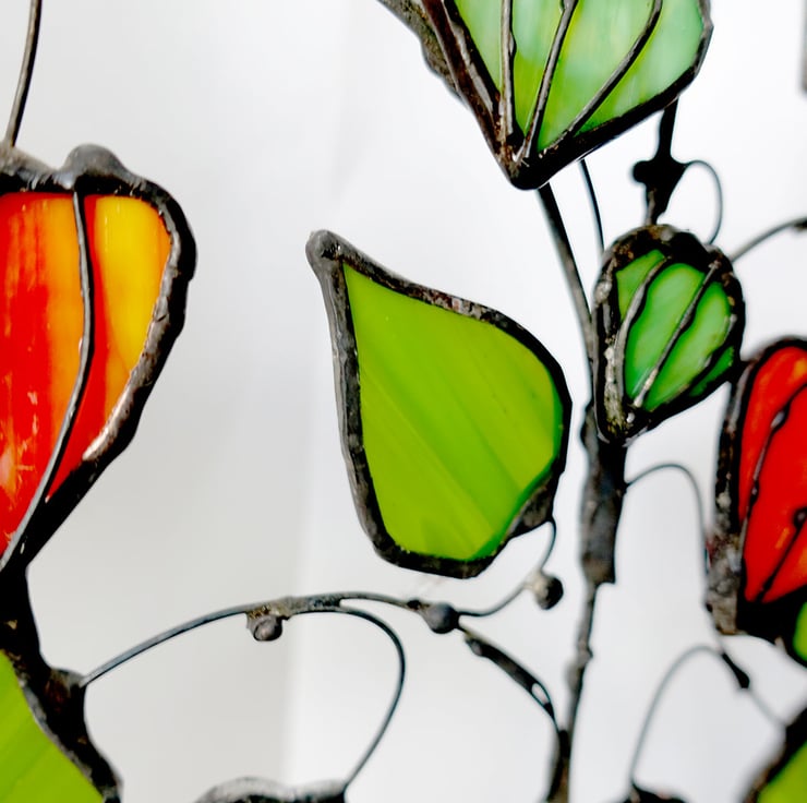 I've recreated this with orange ring mottle glass for the lanterns and deep lime green for the leaves. The glass art piece slots into a solid Tulip wood base. This item comes in a luxury black matt gift box.
