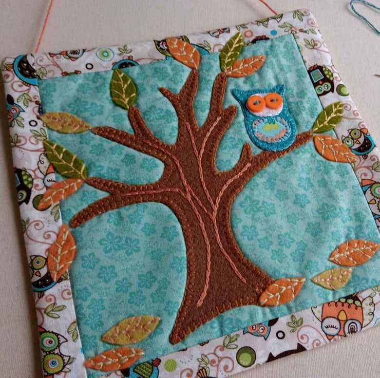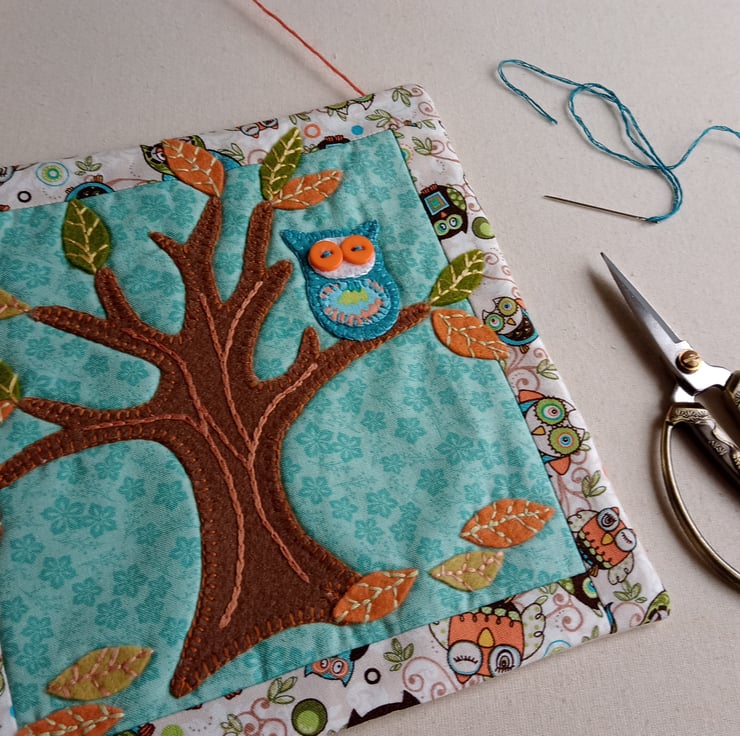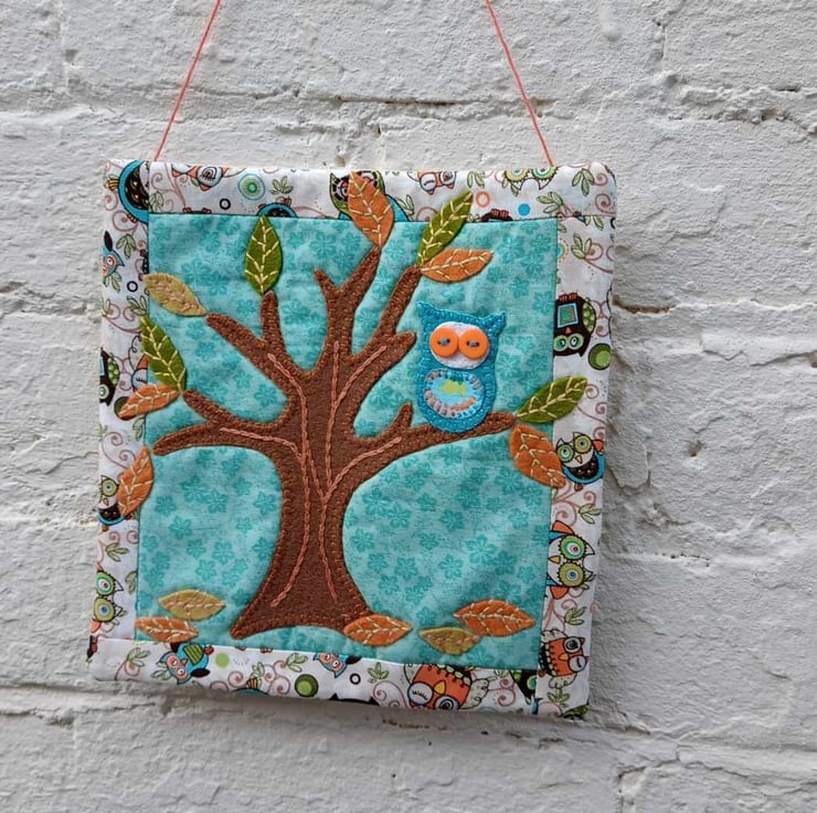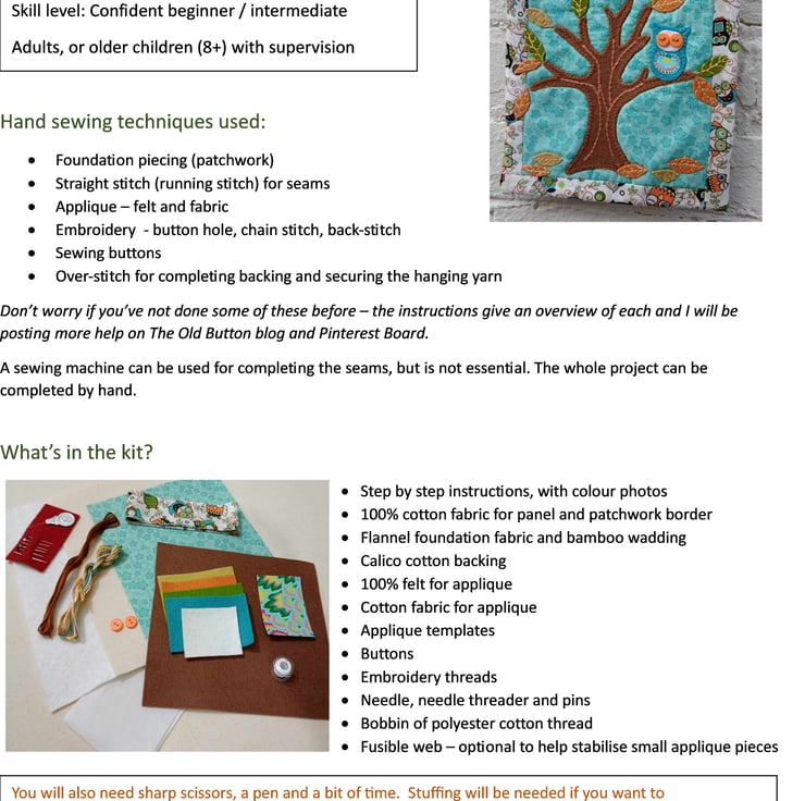 This is a sew it yourself kit for my own design, featuring a wise owl in a tree with autumn leaves. Suitable for a confident beginner or intermediate sewist, with lots of detailed instructions to help develop specific sewing skills.