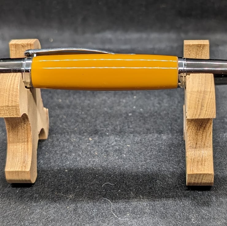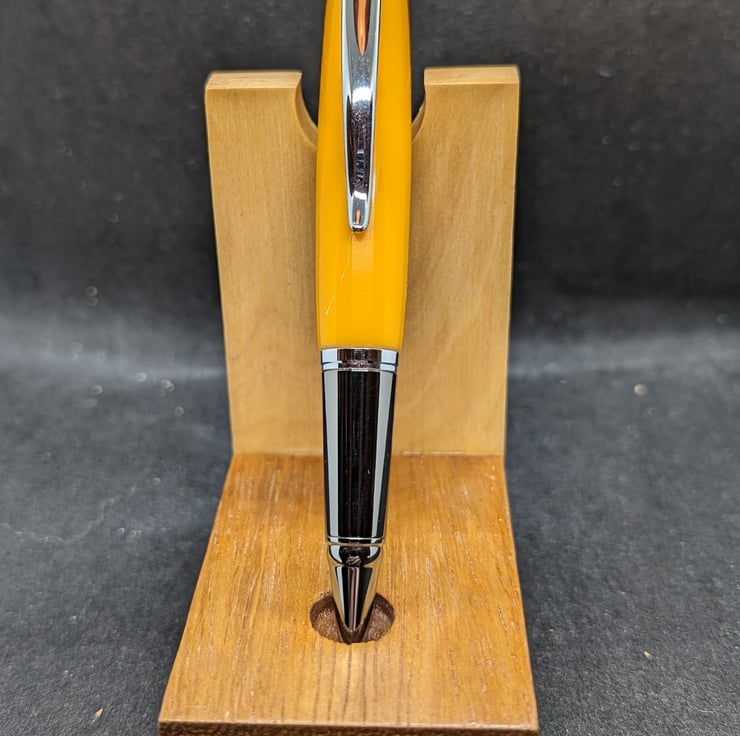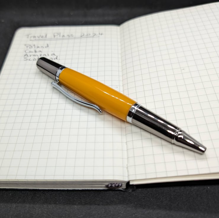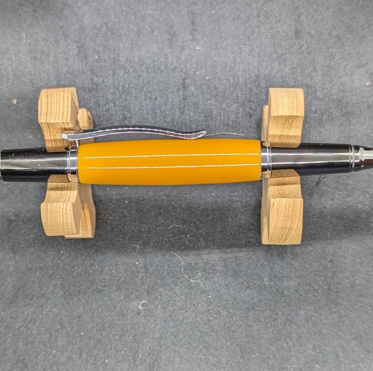 A hand turned twist action rollerball pen in vibrant orange with black and chrome metal parts.. The tip unscrews (be careful of the spring) and it then takes Parker style refills. it will be packaged in a material lined card box. Find links to refills at characterpens.co.uk F313