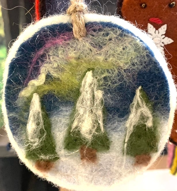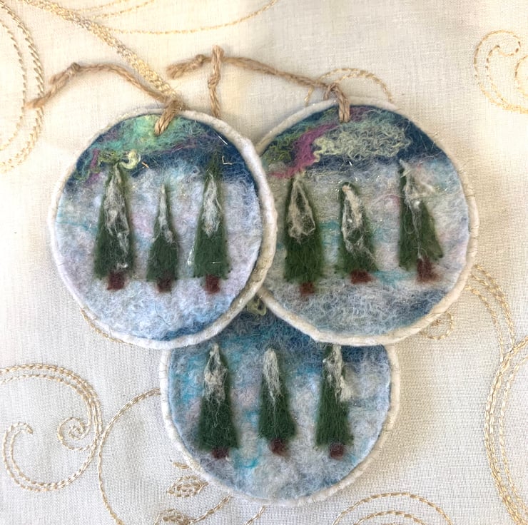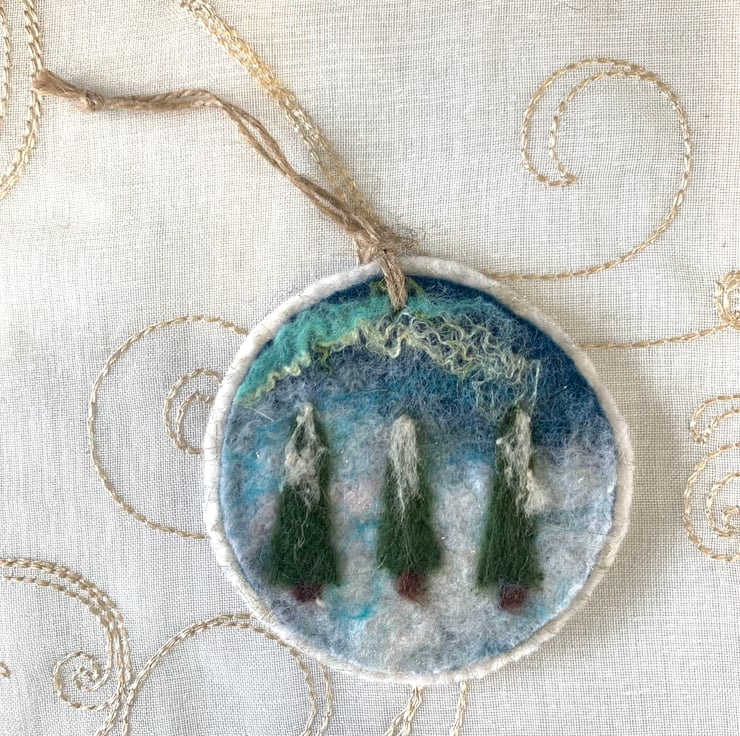Gorgeous, hand felted circular tree decoration. With a mini Winter scene created from a mixture of wet and needle felting techniques. Lovely to pop on a Christmas tree or simply hang on a wall, or next to your workspace. A real keepsake to love each year as part of your Christmas decoration collection.