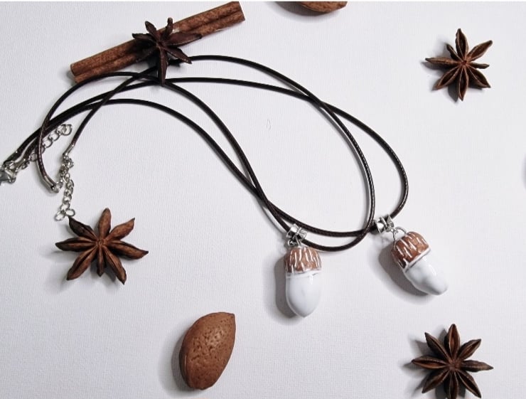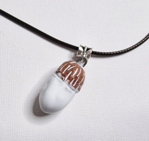 A ceramic acorn pendant with necklace.