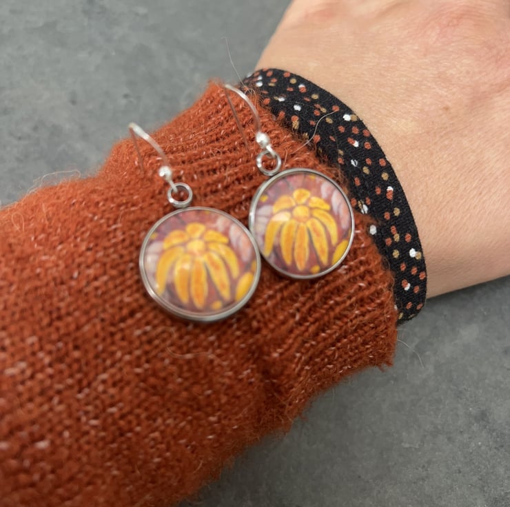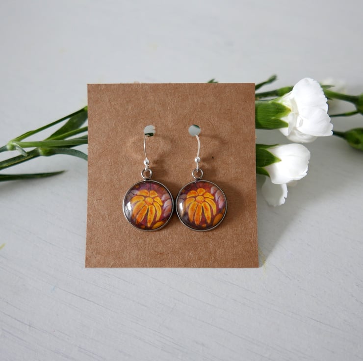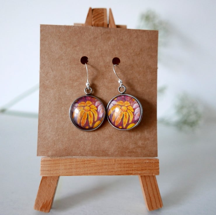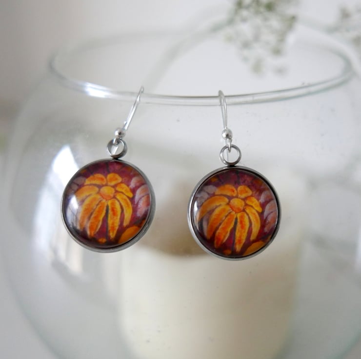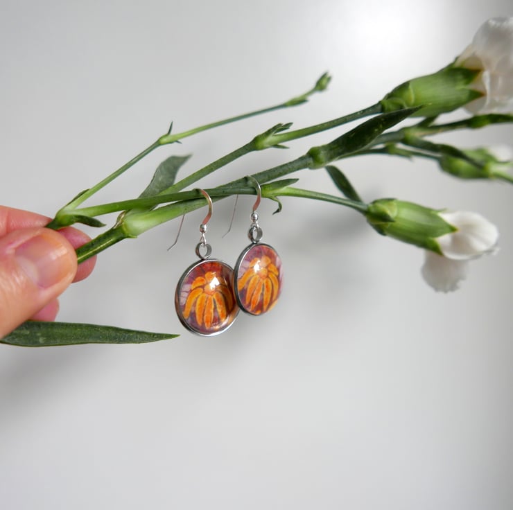 These orange autumnal dangle earrings are created using two mini art prints after one of my original paintings. The image is printed at home on a 300gsm card and then it's glued onto the metal bezel and under the glass cabochon. The predominant cololour is orange and it's perfect for autumn. I attached a sterling silver hook and the measurement of the dangle is approximately 0.8" and with the hook is approximately 1.7". The metal of the dangle is stainless steel.