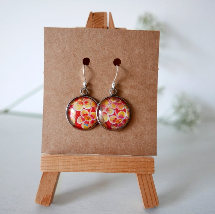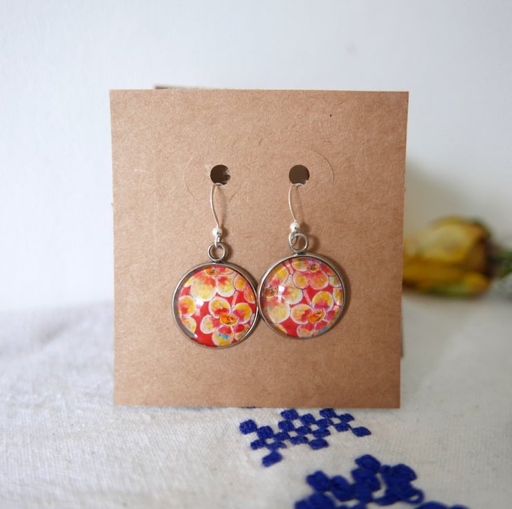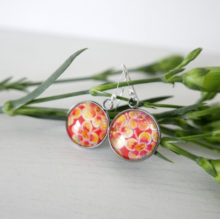These red dangle earrings are made using art prints after one of my original paintings which is printed at home on a 300 gsm card and glued onto the metal bezel and under a glass cabochon. The image is very detailed showing orange and red flowers against a red background with hints of turquoise. These are very pretty and look very nice as part of your summer outfit.