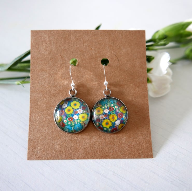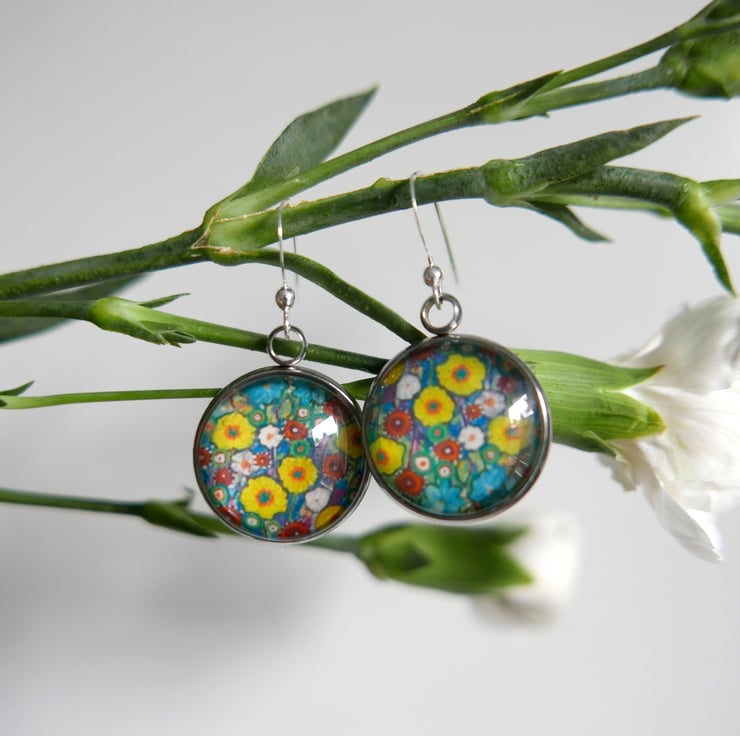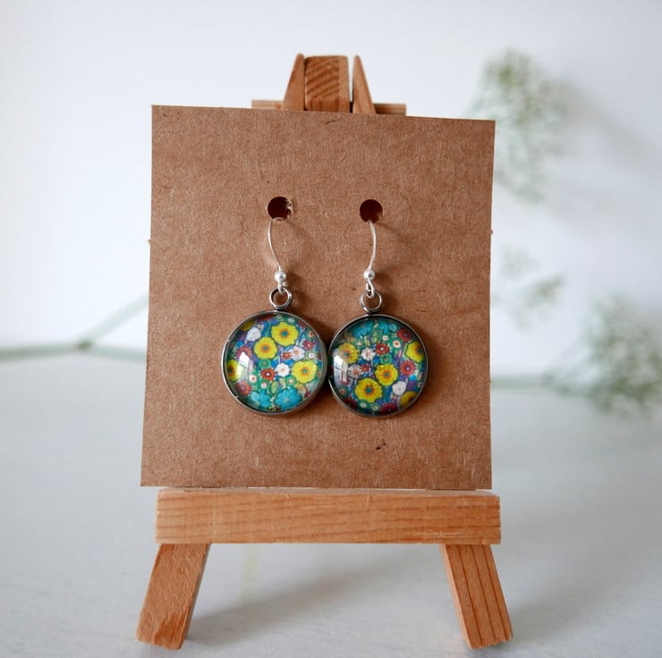 The images show multicolored wildflowers, predominantly yellow and turquoise. The art prints are printed at home on a 300 gsm card and then they are glued onto the stainless steel bezel and under a glass cabochon. The dangle is approx 0.8".