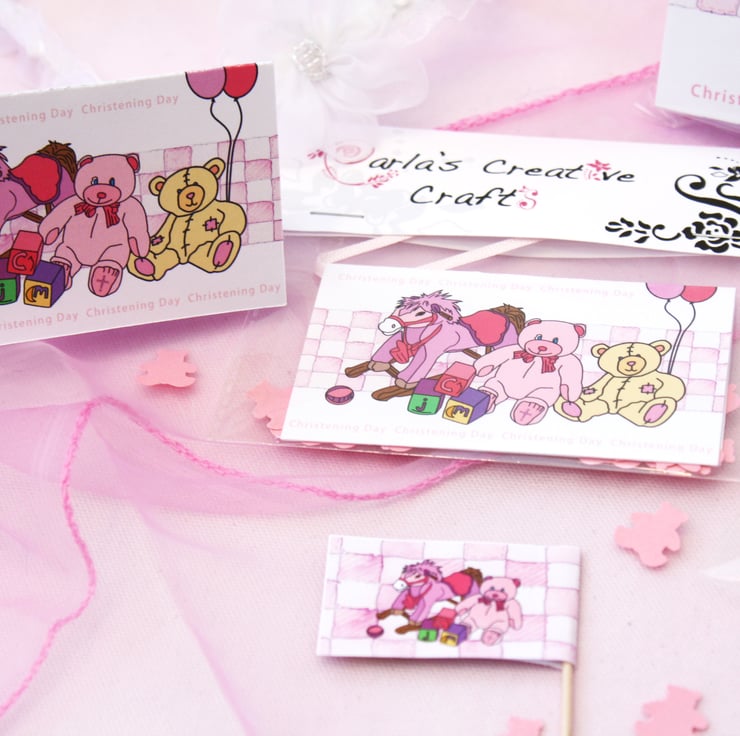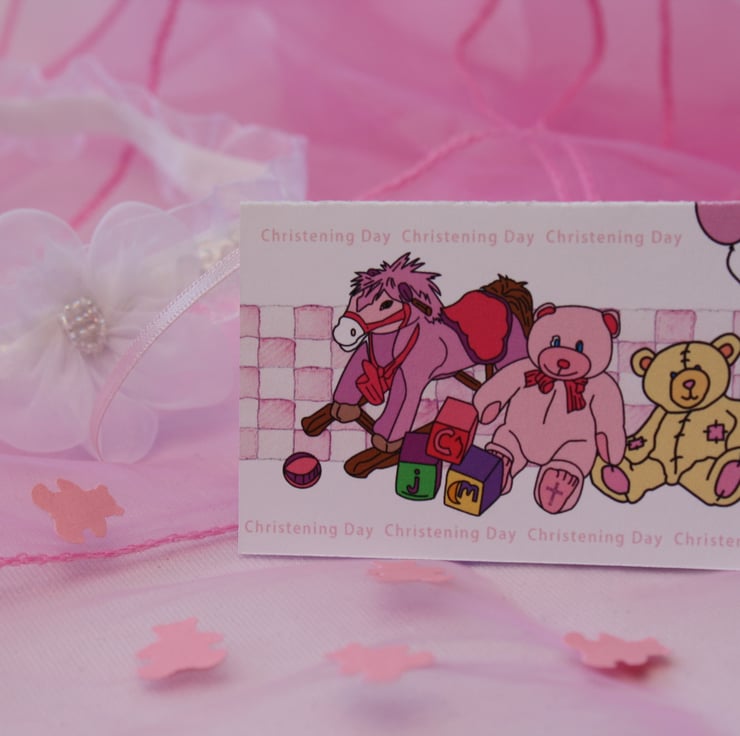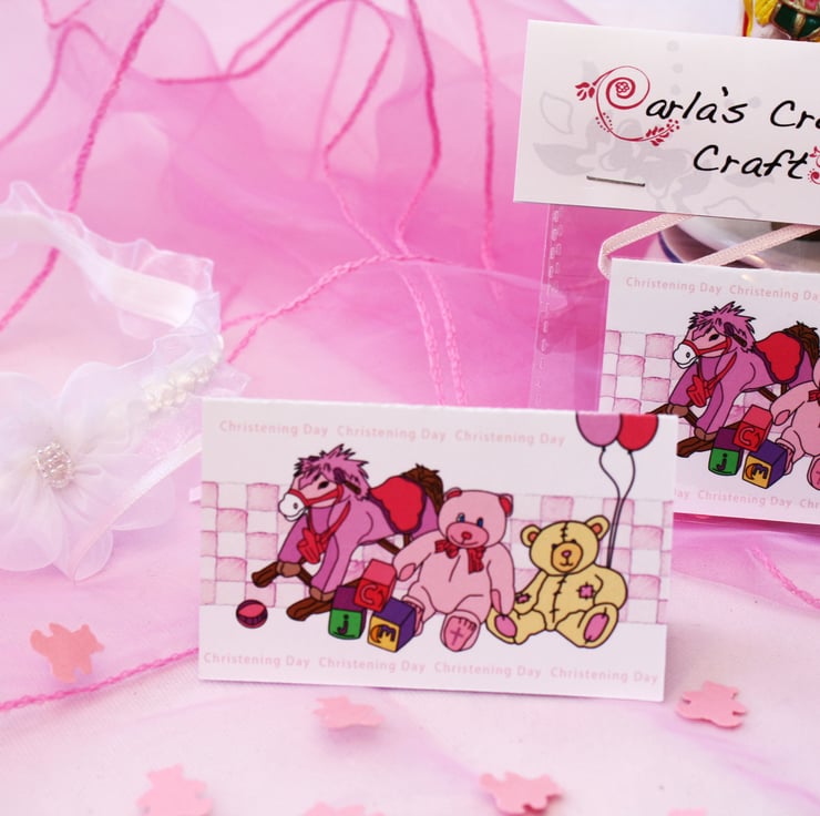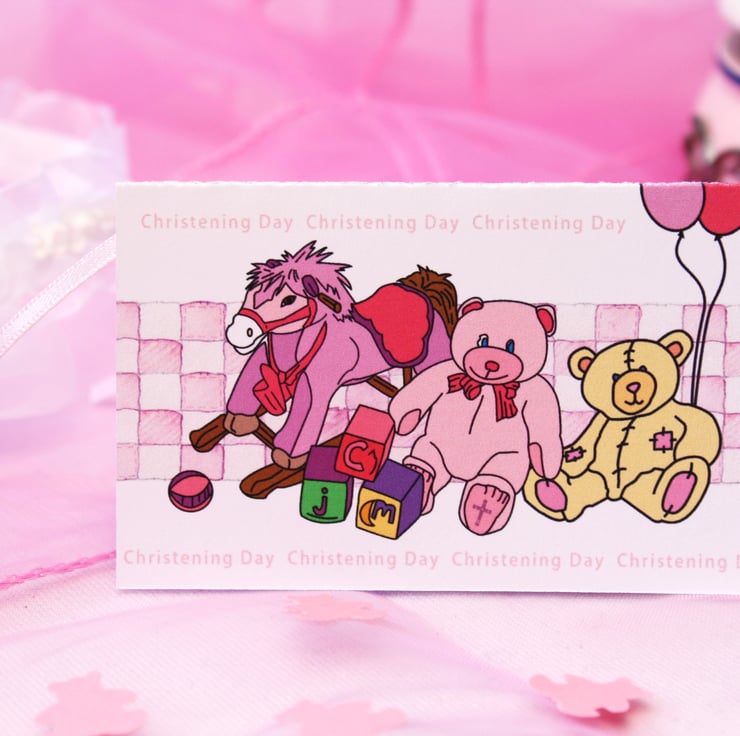 Beautiful hand crafted Christening Day gift tag & confetti, made just for you. Each set includes a gift tag with my teddy and rocking horse design. The tag measures approximately 5.5cm in height and 9cm in width. The tag comes with a baby pink ribbon to attach to your gift/gift bag. The inside of the tag has been left blank for your message.