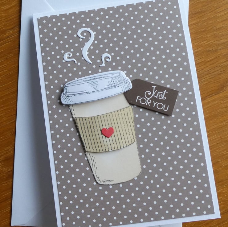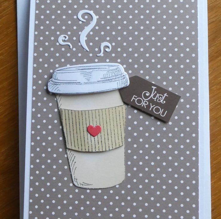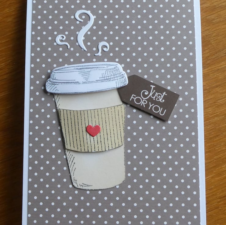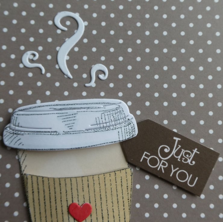 The design has been completed with die cut wafts of steam and a chocolate brown tag style greeting with the message 'Just For You'.