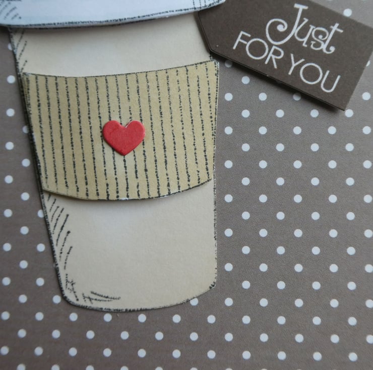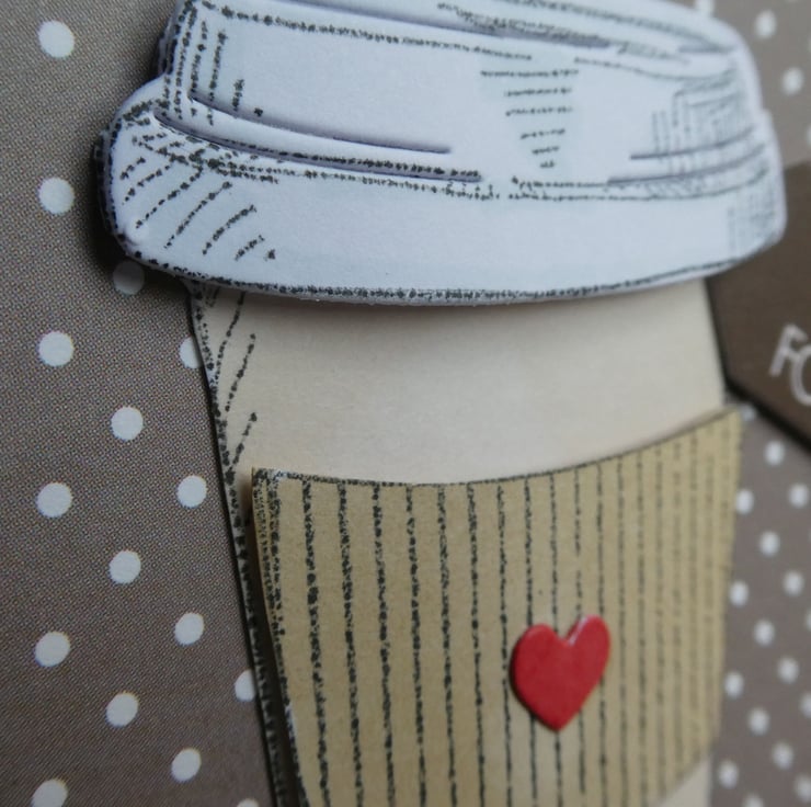 A base of coffee and white polka dot card has been topped with a hand stamped and coloured coffee cup with sleeve with a red heart detail. The lid and coffee sleeve have been raised on foam pads to add dimension.