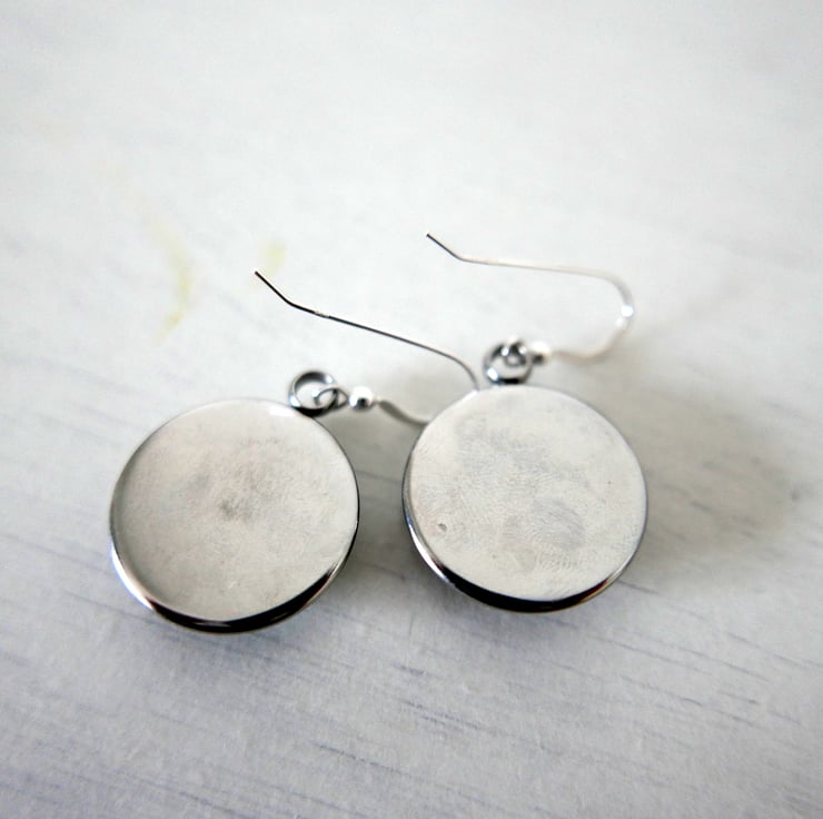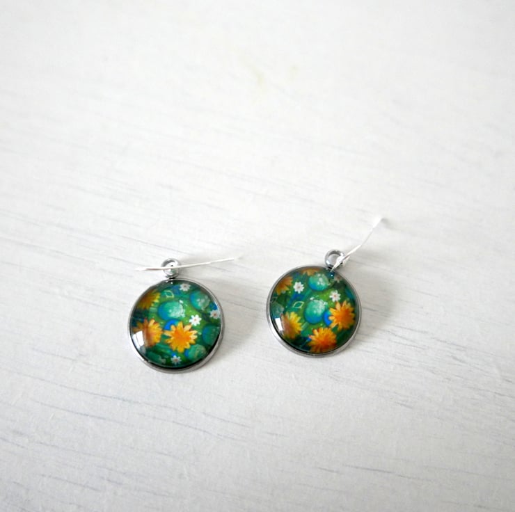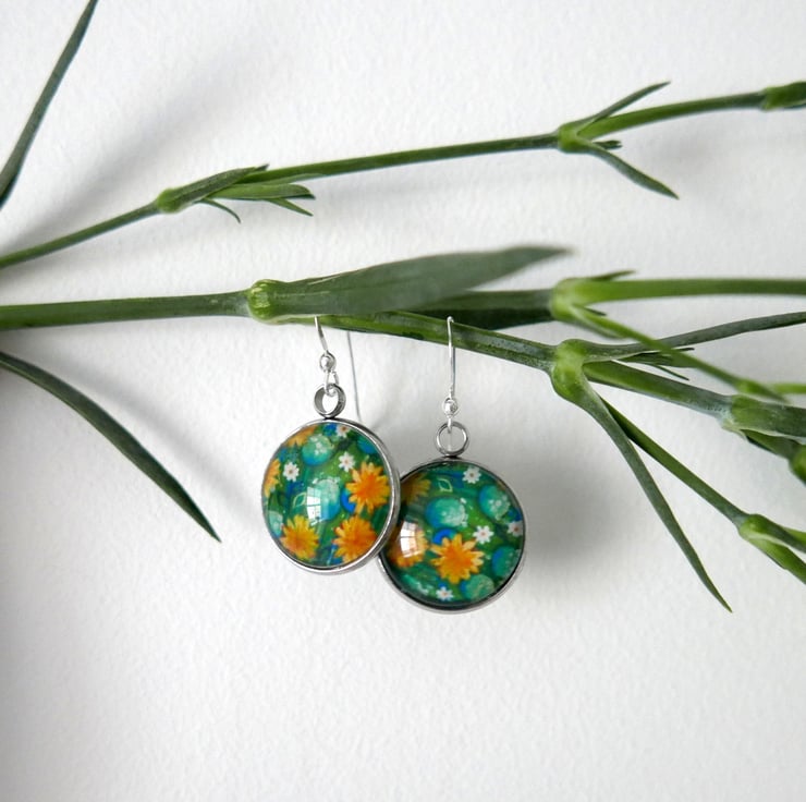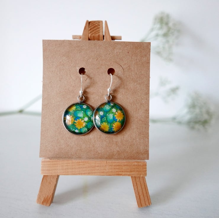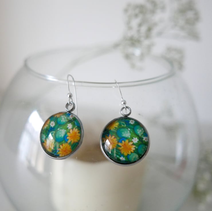 I created these green dangle earrings using art prints after one of my original paintings. The images are printed at home on a 300 gsm card and they show yellow dandelions against a green summery background. The prints are fixed onto the stainless steel bezel and under a glass cabochon. The dangle is round and it measures 0.8". I attached a sterling silver hook so the whole earrings measure approx. 1.7" - 1.8".