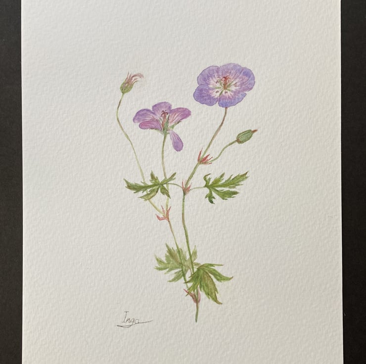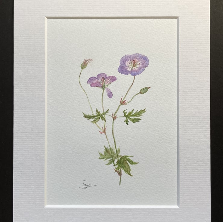 This is my original watercolour painting of 'Wood crane's-bill (Geranium sylvaticum)’. It is a ‘one-of-a-kind’, unique item and is signed by me. It has been painted using quality paints onto an A5 cold pressed watercolour paper.