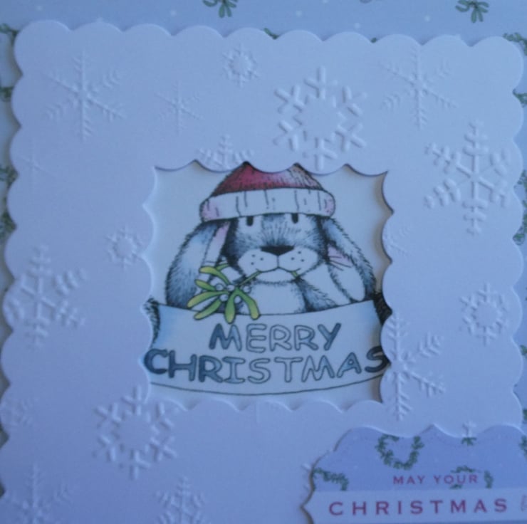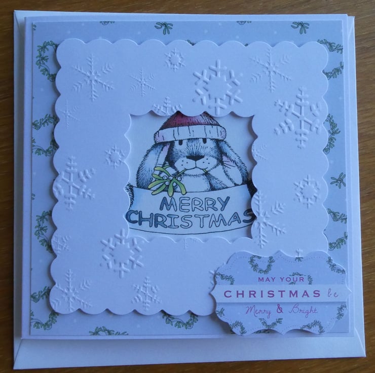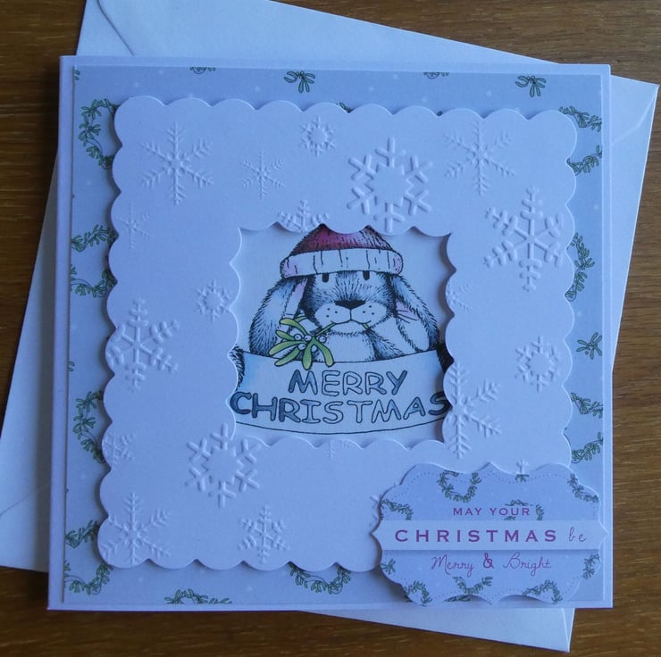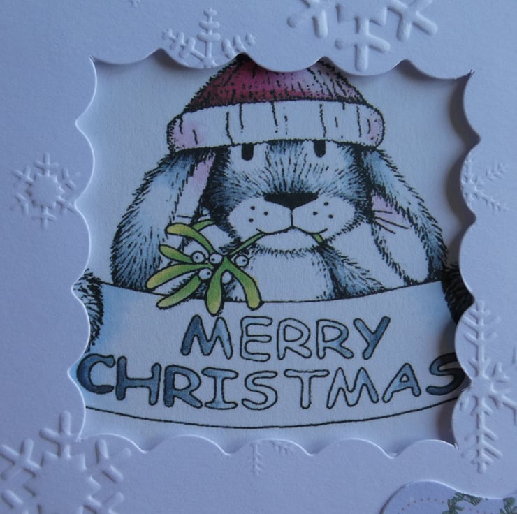 The central printed image shows a grey and white bunny with a red and white knitted hat, holding a banner with the message Merry Christmas in his hans and a sprig of mistletoe in his mouth.