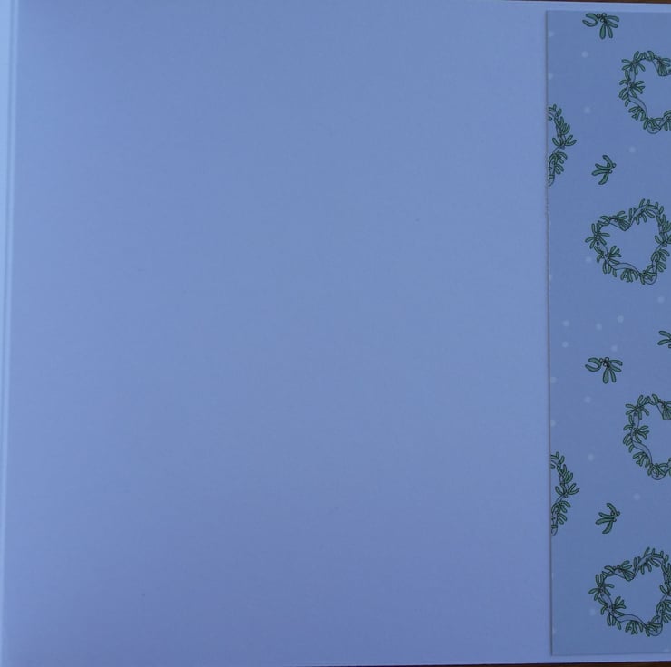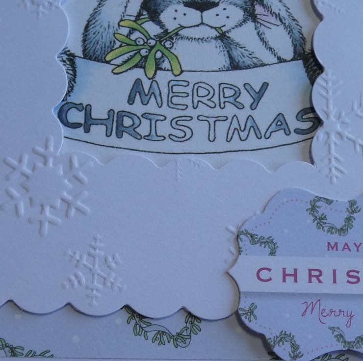 The image has been mounted onto a background of pale blue paper decorated with mistletoe wreaths and has been framed with a white scallop edged frame embossed with snowflakes.