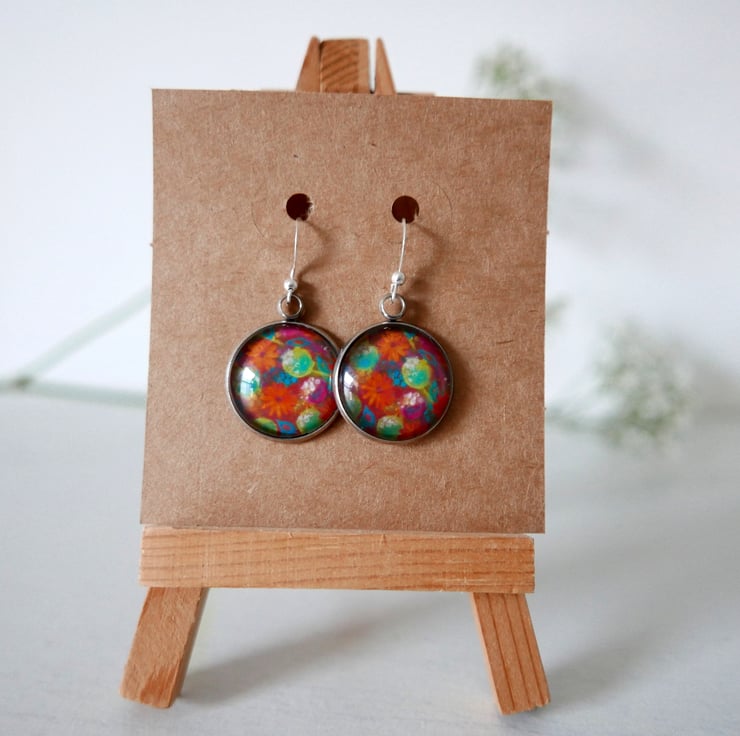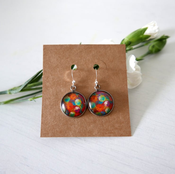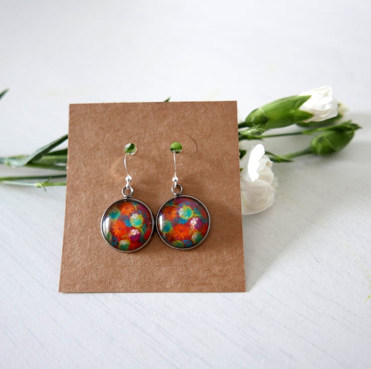 These meadow orange dangle earrings are created using mini art prints after one of my original floral art paintings. The images are printed at home on a 300 gsm card and then glued onto the stainless steel setting and under a glass cabochon. The dangle is round and measures approx. 0.8" I attached sterling silver hooks and the whole drop earring measures approx 1.6"-1.7".