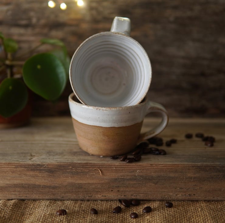 Hand thrown on the potter's wheel from a toasty dark clay. They are glazed in a white glaze which breaks brown on texture giving a rustic look. The exterior rim is glazed and the lower part of the mug is bare clay which gives a lovely textural feel in the hand.