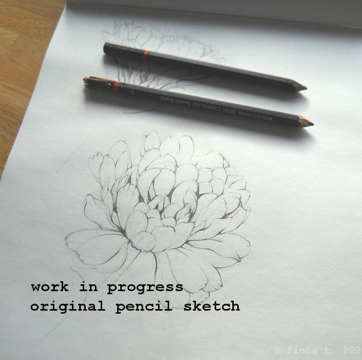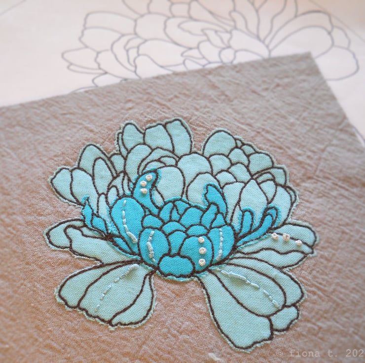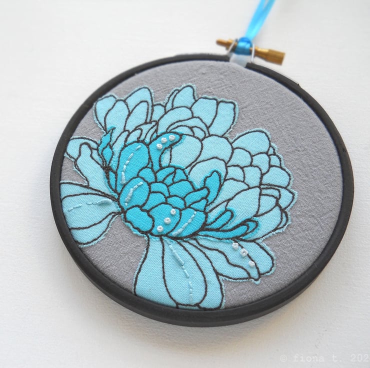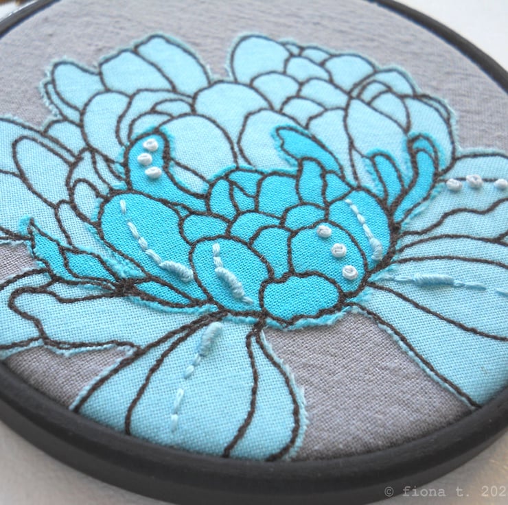 translated from my original pencil drawing, this small emerging flower is free hand embroidered in bright blue cottons on to hand dyed grey cotton calico.