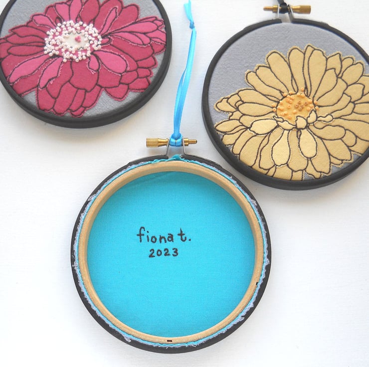 this textile sketch is mounted in a 4" black painted bamboo hoop, and is signed & dated on the reverse, in freehand stitched text, on a coordinating turquoise blue cotton.
