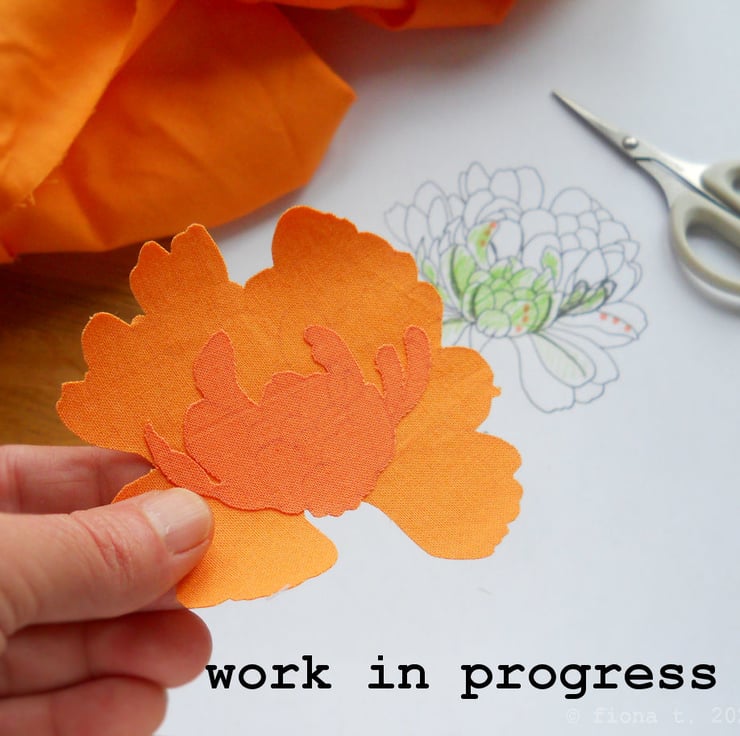 the fabric is hand cut, layered and appliqued onto calico, before drawing the details on freehand, using free motion embroidery.