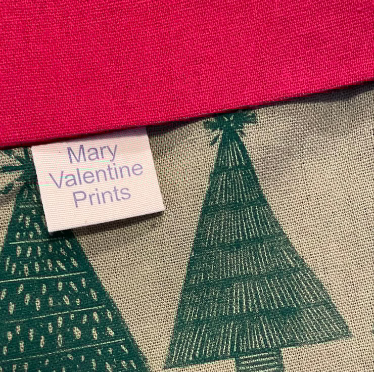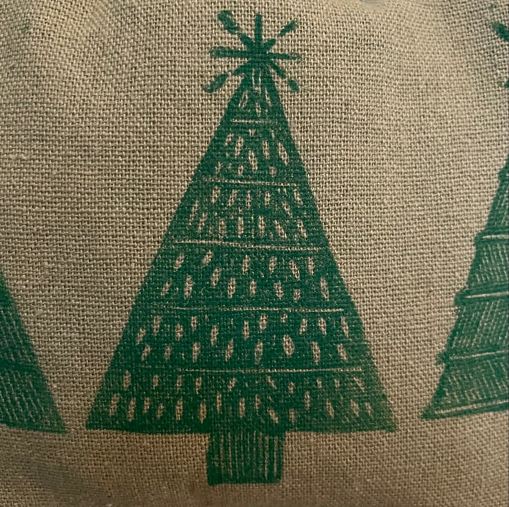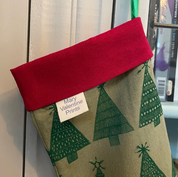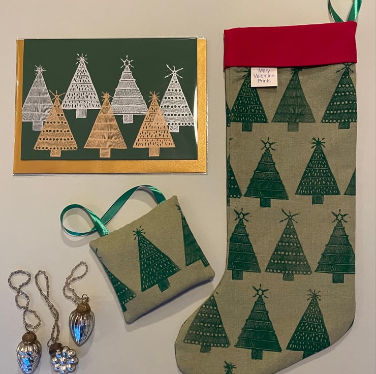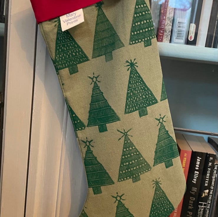 I have handprinted the fabric for these stockings using hand carved lino in my original Christmas Tree design.
