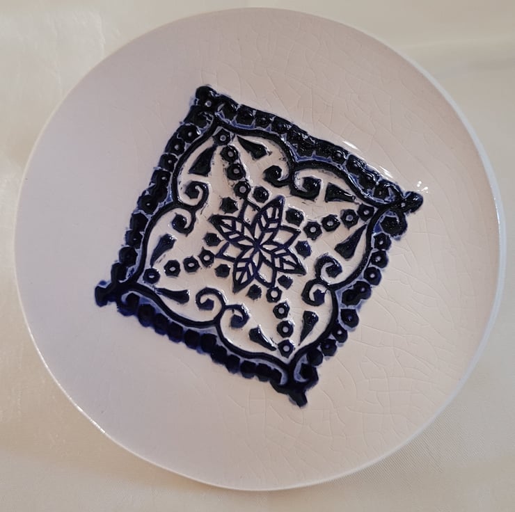 This handcrafted ceramic dish has been created using the slab-work method and embossed with a mandala design using an Indian carved stamp before shaping into a mould. Once dried it has been bisque fired to 1000C and hand-painted with a coloured glaze and a clear glaze has been added. After glazing it has had a second firing in the kiln to 1080C.